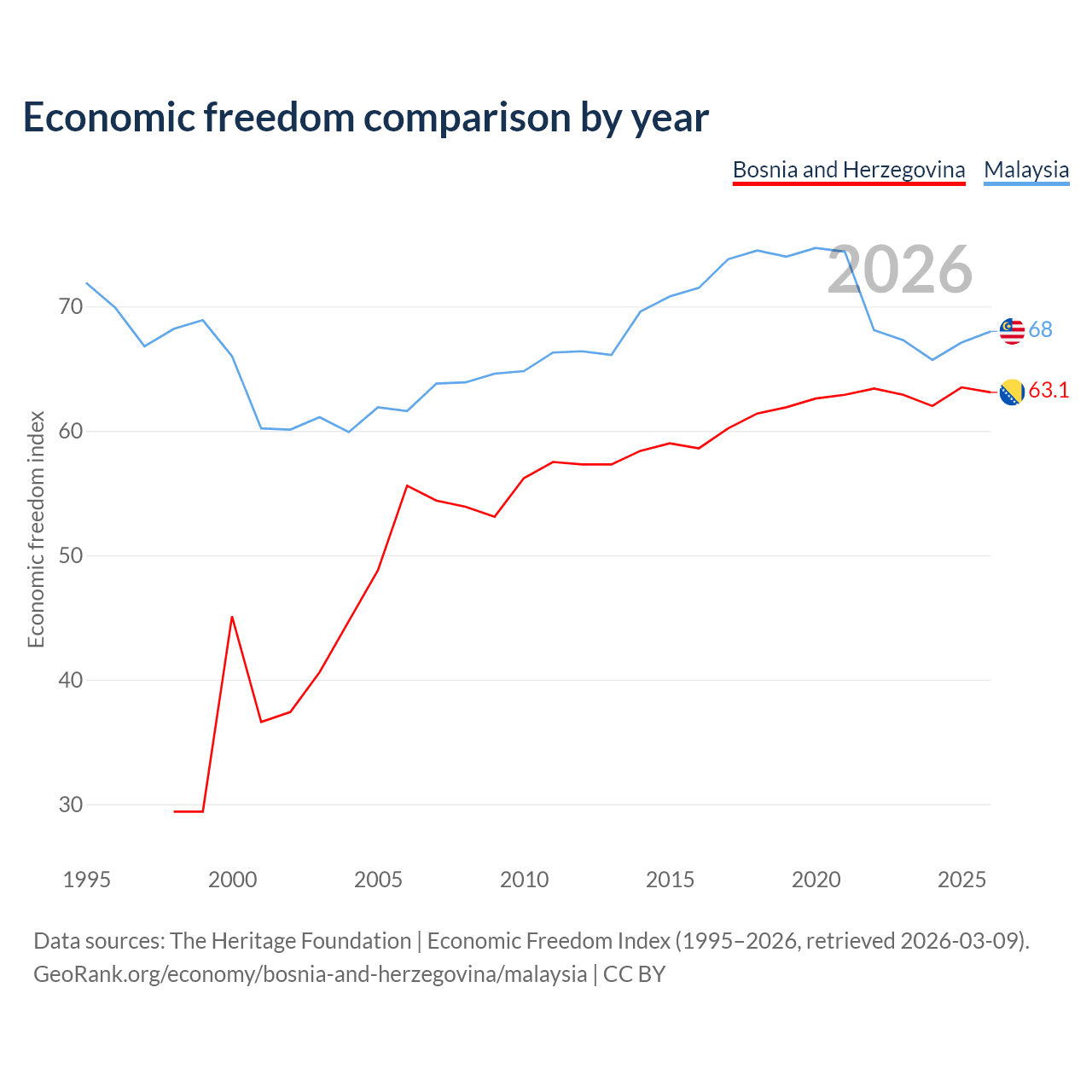 The Economic Freedom Index for Bosnia and Herzegovina is 63.1, ranking 83/197, compared to 68 for Malaysia, ranking 51/197. The chart above displays a comparison of annual changes in economic freedom indexes.