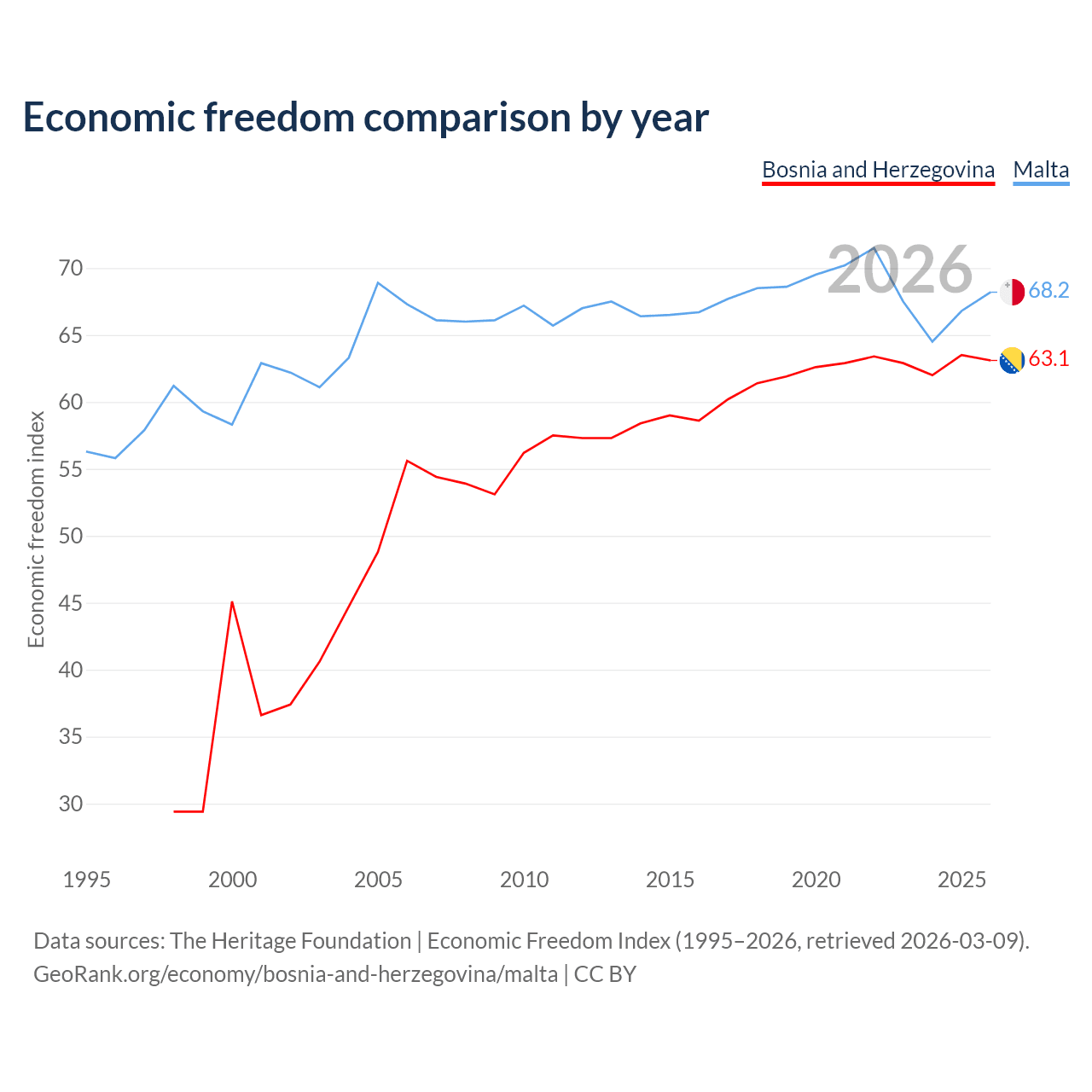 The Economic Freedom Index for Bosnia and Herzegovina is 63.1, ranking 83/197, compared to 68.2 for Malta, ranking 49/197. The chart above displays a comparison of annual changes in economic freedom indexes.