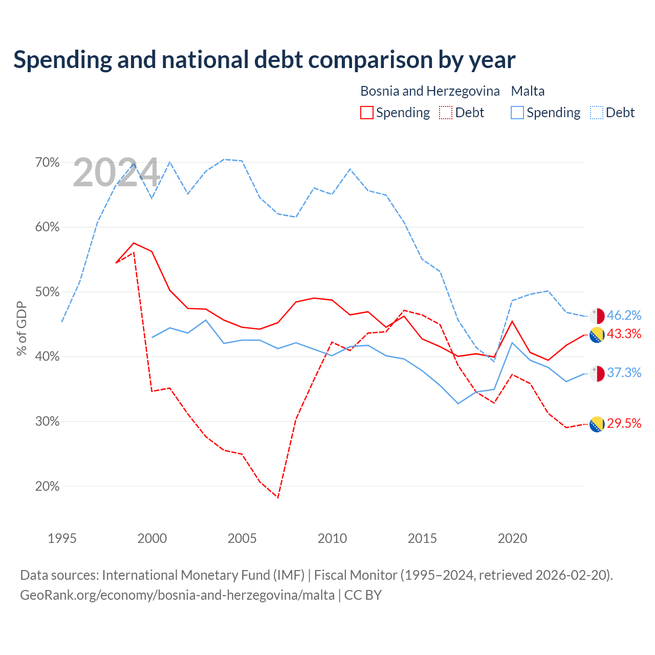 Bosnia and Herzegovina has $8.74B in government debt (29.5% of GDP), compared to $11.5B (46.2% of GDP) in Malta.