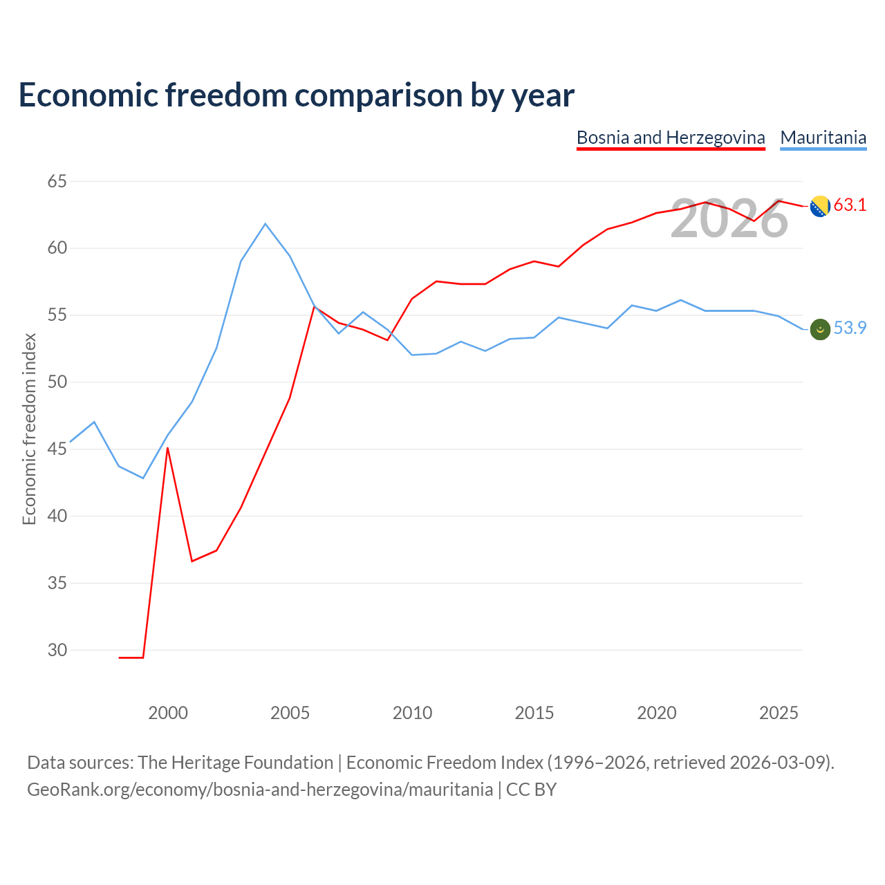 The Economic Freedom Index for Bosnia and Herzegovina is 63.1, ranking 83/197, compared to 53.9 for Mauritania, ranking 136/197. The chart above displays a comparison of annual changes in economic freedom indexes.