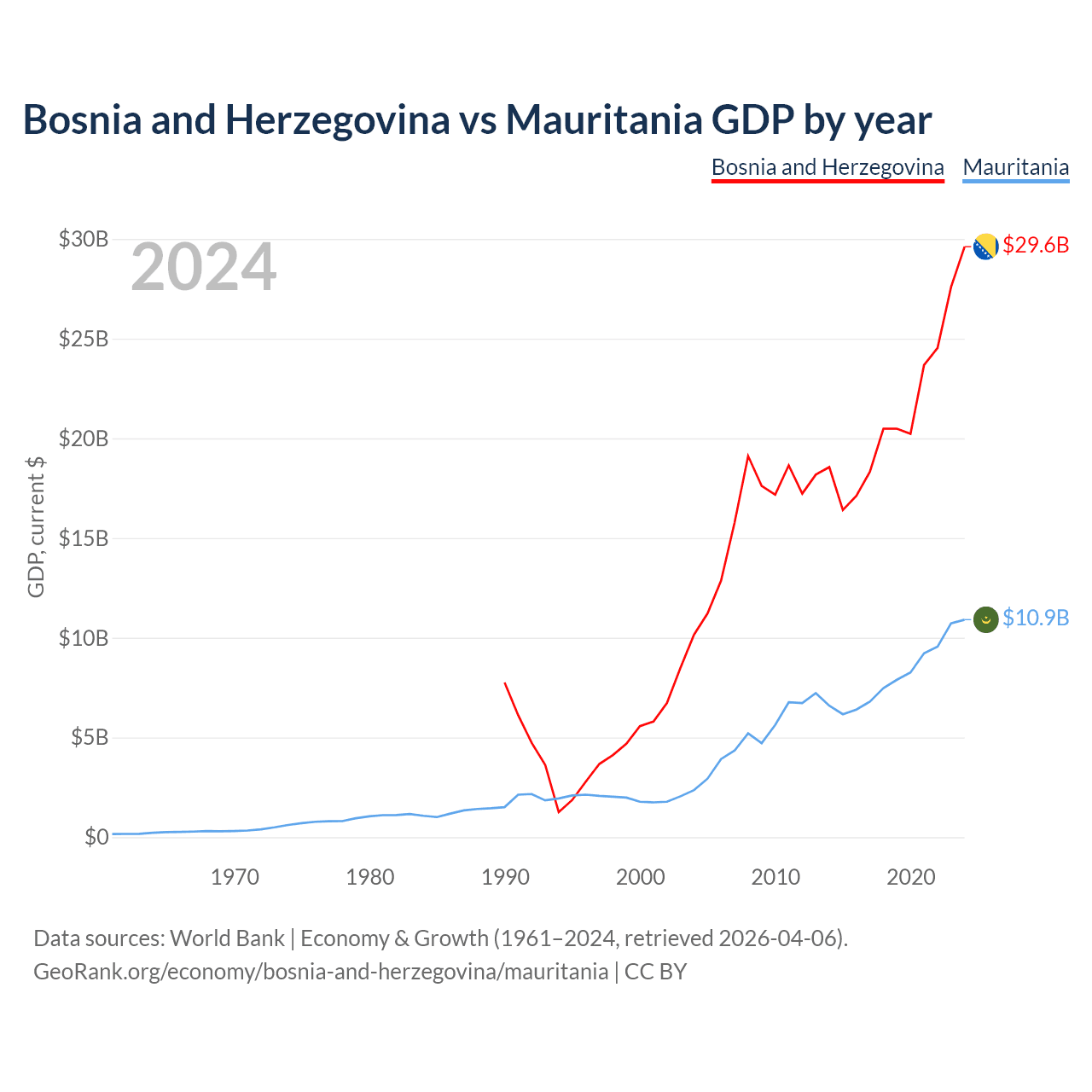 Bosnia and Herzegovina has a GDP of $29.6B compared to $10.9B for Mauritania, ranking 111/197 and 153/197 by economy size, respectively.