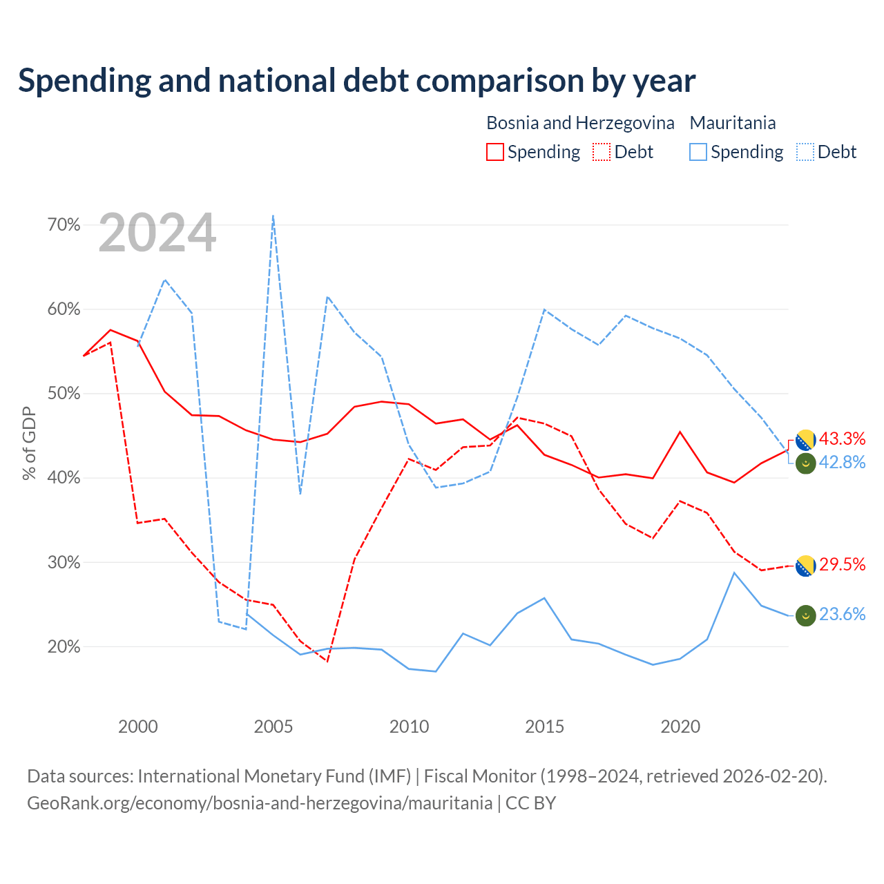 Bosnia and Herzegovina has $8.74B in government debt (29.5% of GDP), compared to $4.67B (42.8% of GDP) in Mauritania.