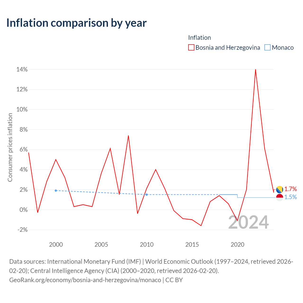 Over the past 21 years, Bosnia and Herzegovina has recorded an average annual inflation rate of 1.61%, compared with 1.58% in Monaco. In 2020, inflation was 1.7% in Bosnia and Herzegovina and 1.5% in Monaco.