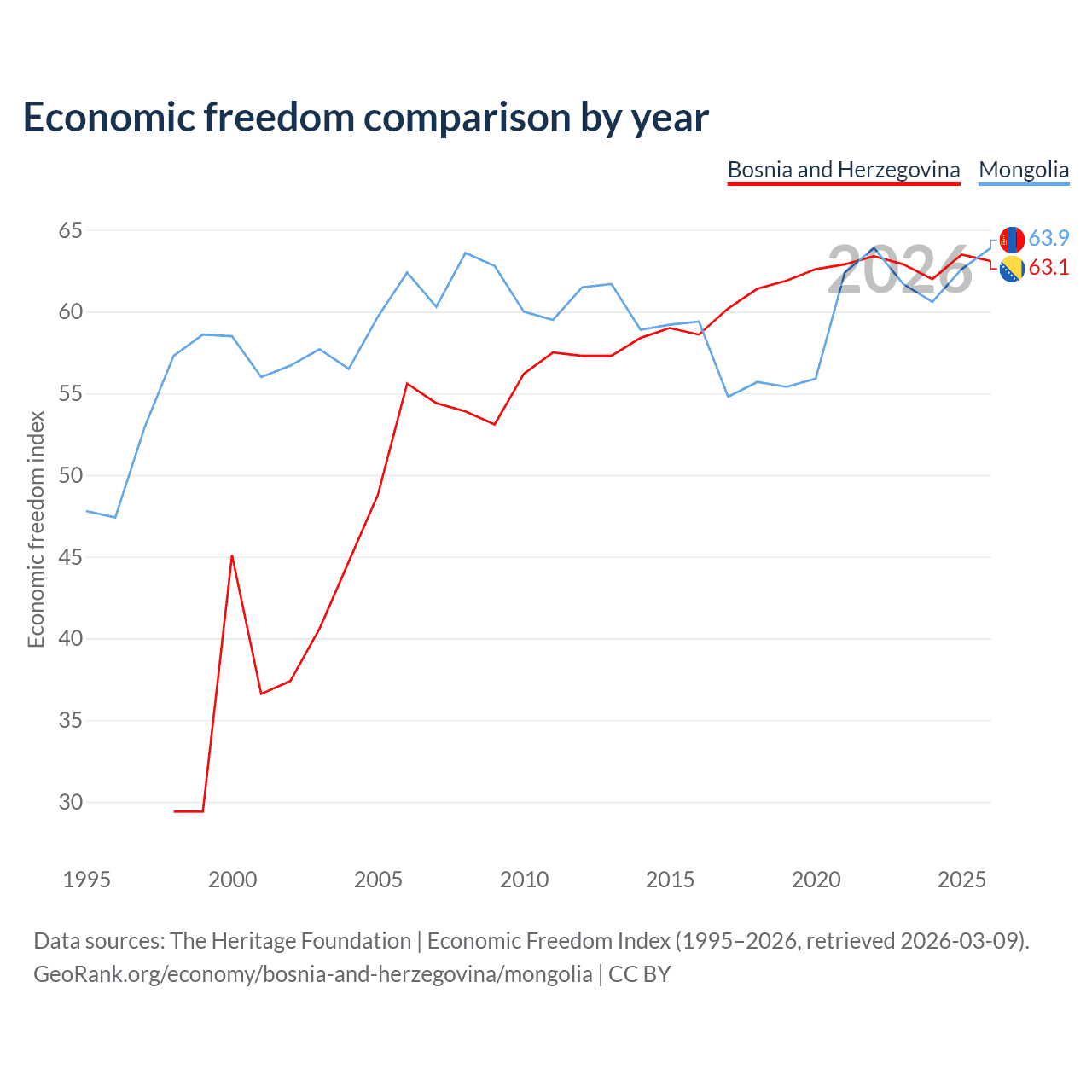 The Economic Freedom Index for Bosnia and Herzegovina is 63.1, ranking 83/197, compared to 63.9 for Mongolia, ranking 76/197. The chart above displays a comparison of annual changes in economic freedom indexes.