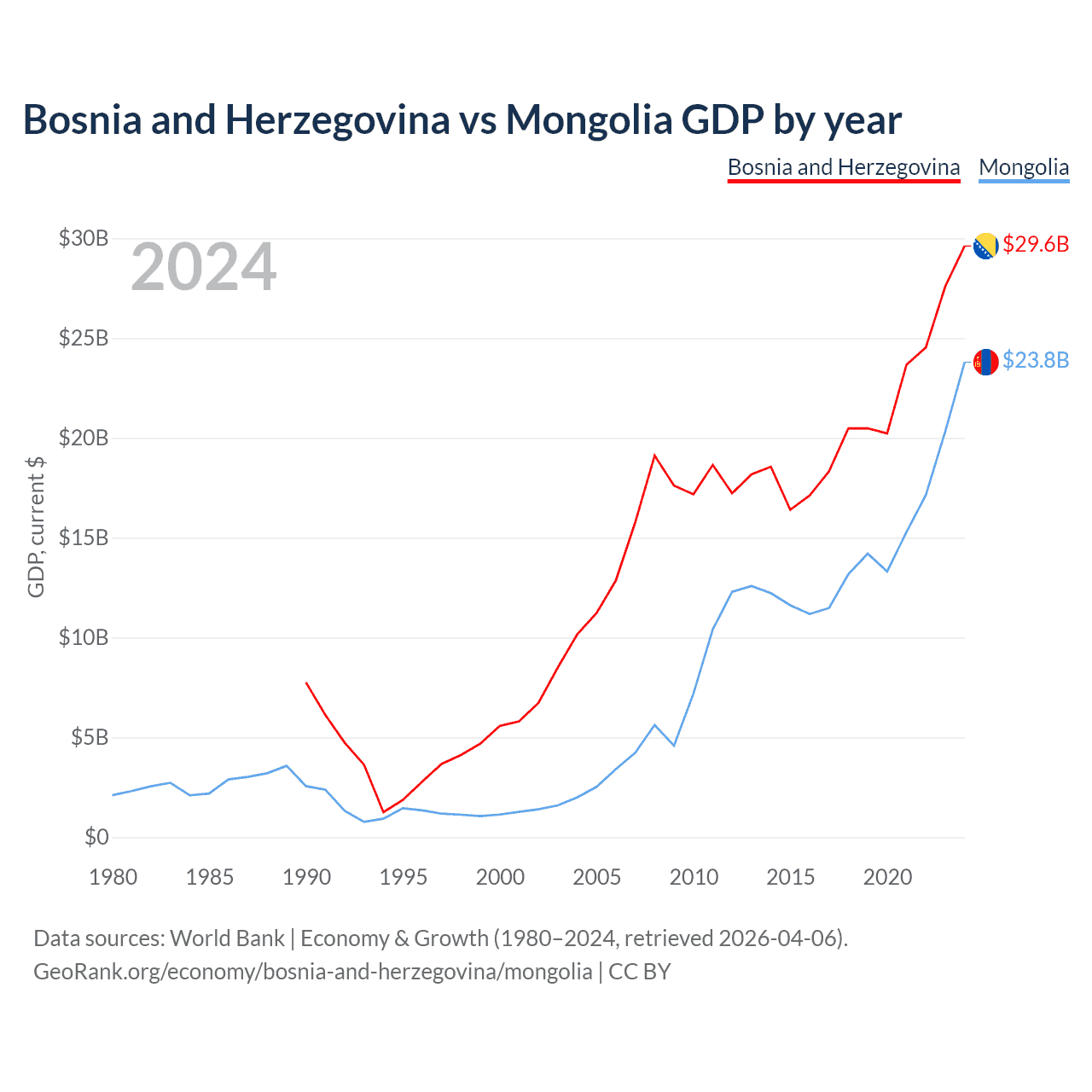 Bosnia and Herzegovina vs Mongolia GDP by year