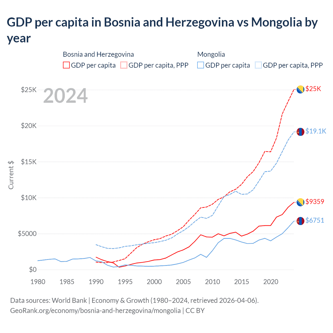 GDP per capita in Bosnia and Herzegovina vs Mongolia by year