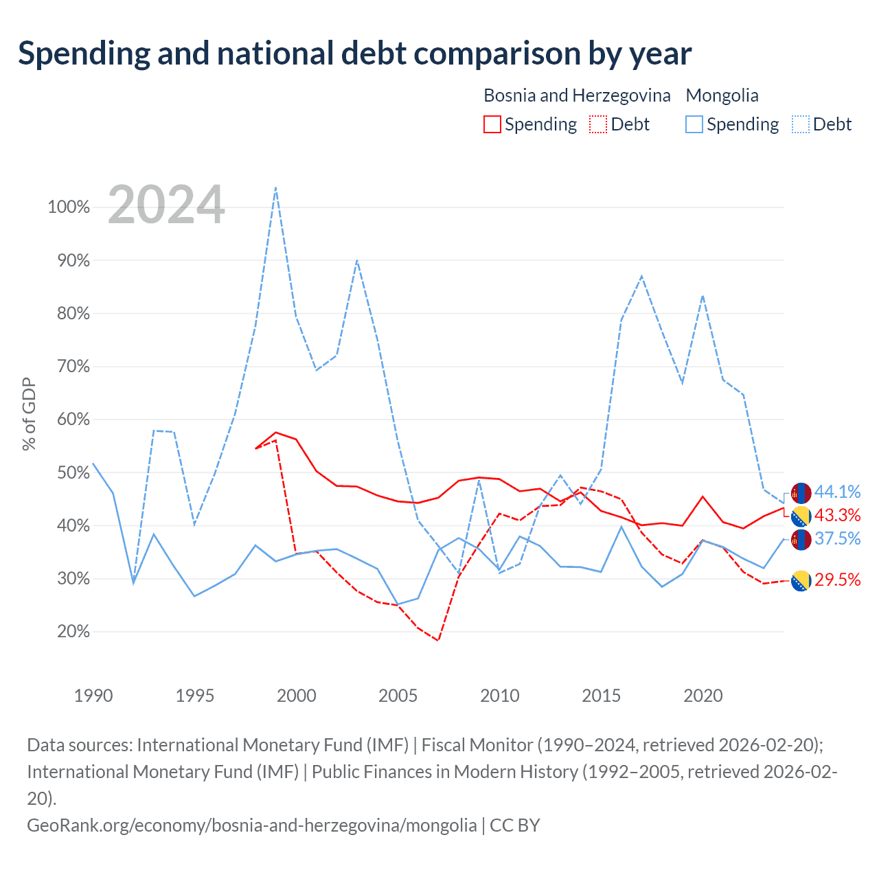 Bosnia and Herzegovina has $8.74B in government debt (29.5% of GDP), compared to $10.5B (44.1% of GDP) in Mongolia.