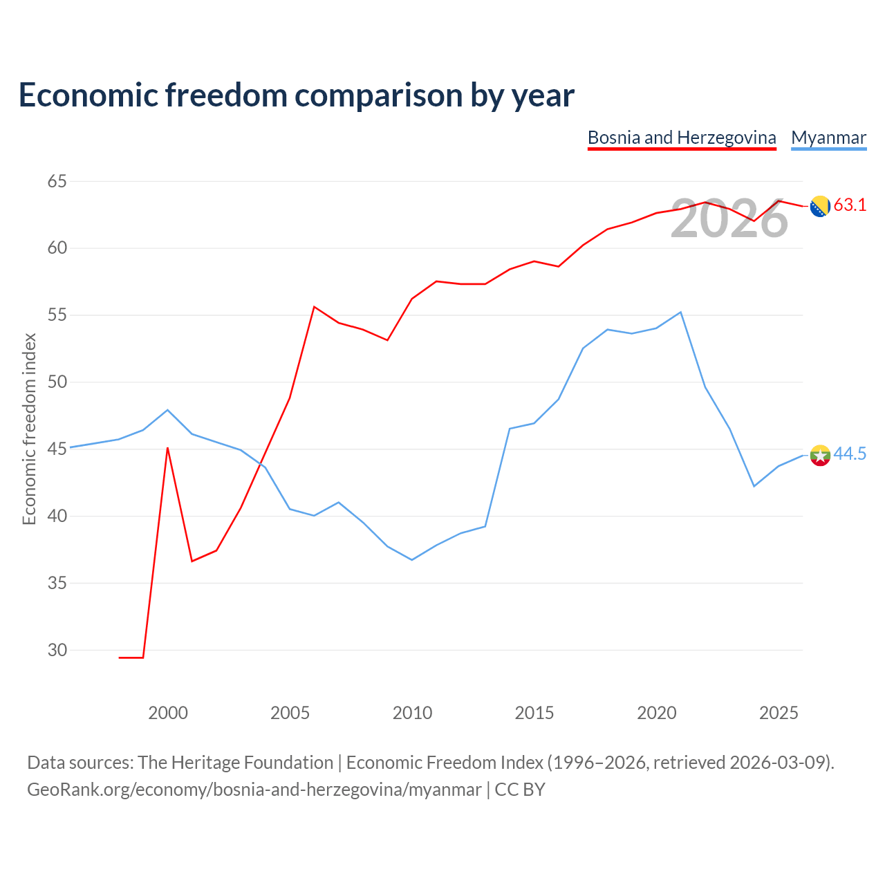 The Economic Freedom Index for Bosnia and Herzegovina is 63.1, ranking 83/197, compared to 44.5 for Myanmar, ranking 180/197. The chart above displays a comparison of annual changes in economic freedom indexes.