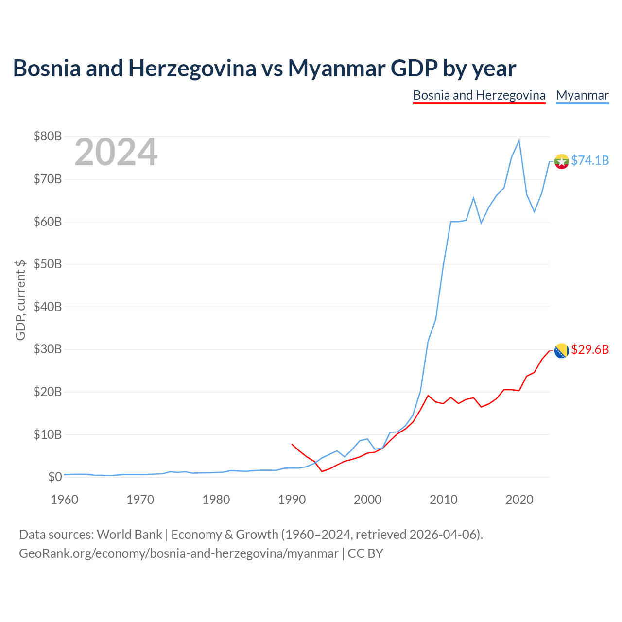 Bosnia and Herzegovina has a GDP of $29.6B compared to $74.1B for Myanmar, ranking 111/197 and 85/197 by economy size, respectively.