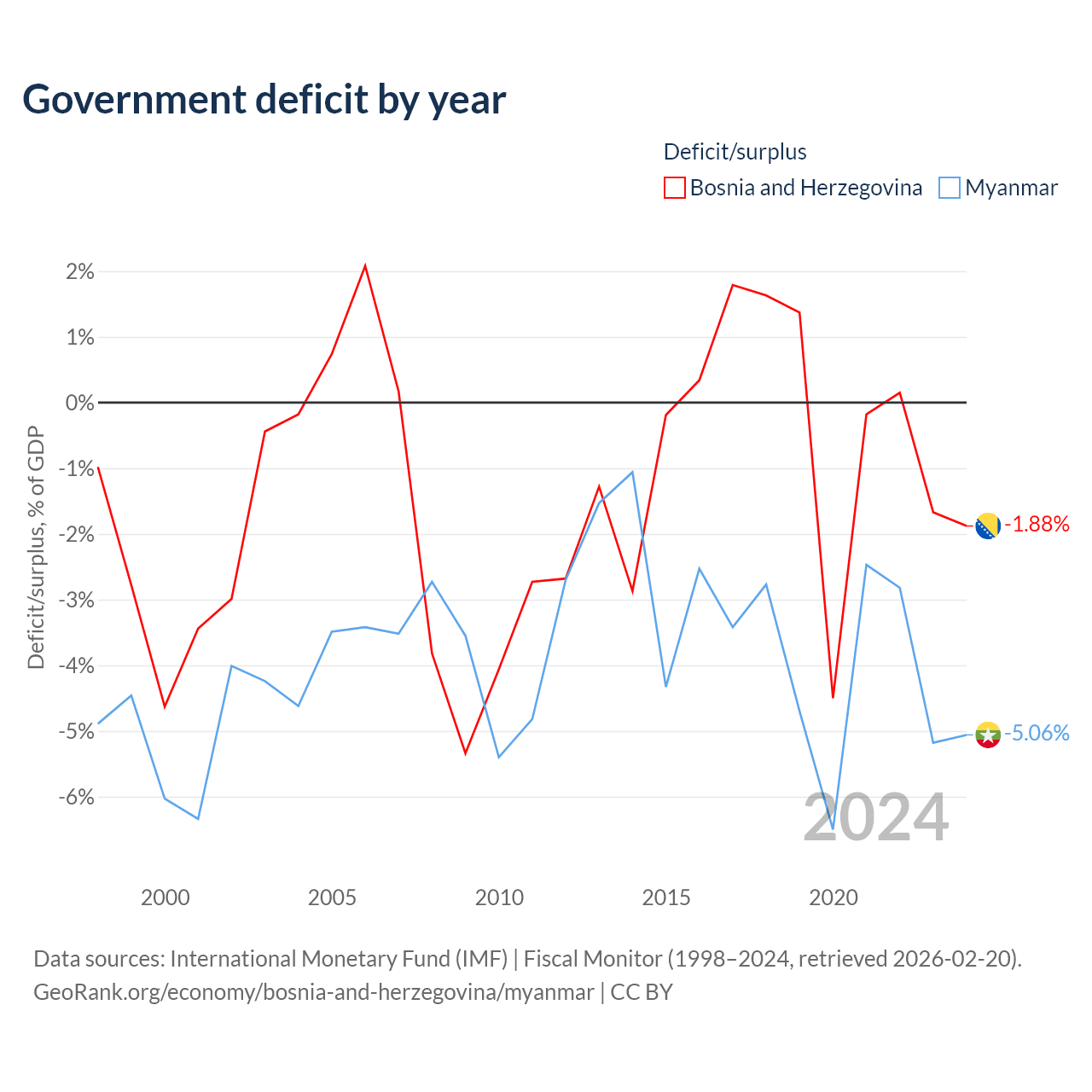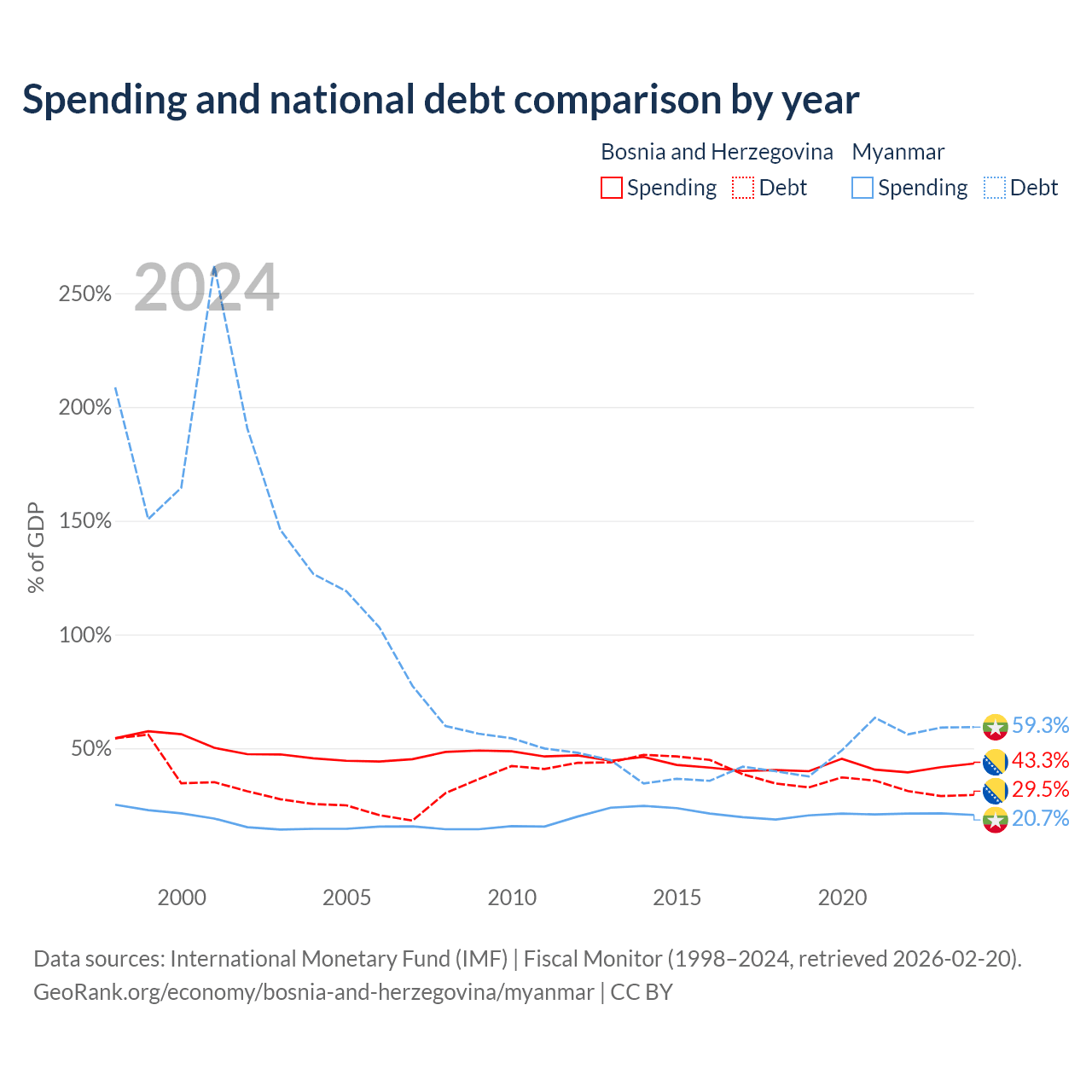 Bosnia and Herzegovina has $8.74B in government debt (29.5% of GDP), compared to $44B (59.3% of GDP) in Myanmar.