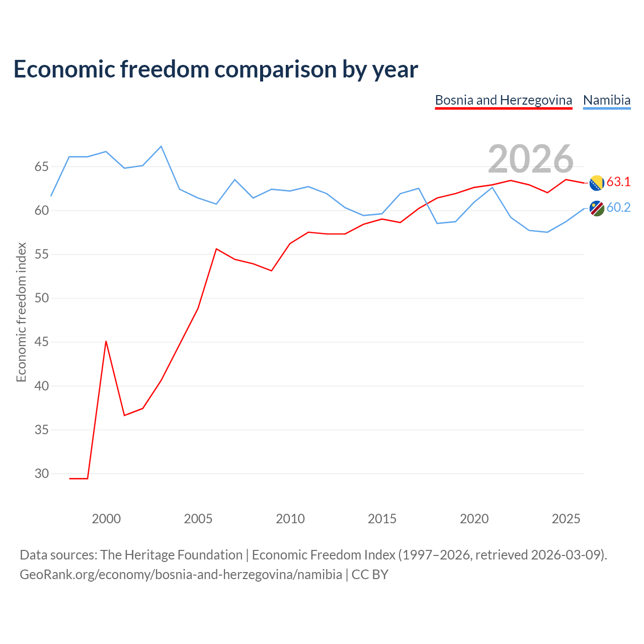 The Economic Freedom Index for Bosnia and Herzegovina is 63.1, ranking 83/197, compared to 60.2 for Namibia, ranking 95/197. The chart above displays a comparison of annual changes in economic freedom indexes.
