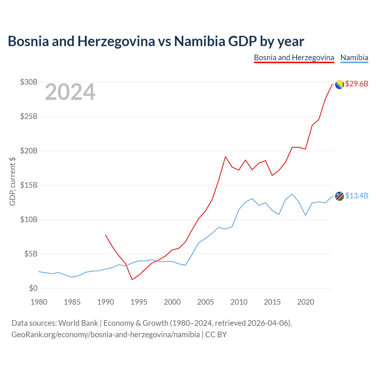 Bosnia and Herzegovina has a GDP of $29.6B compared to $13.4B for Namibia, ranking 111/197 and 147/197 by economy size, respectively.