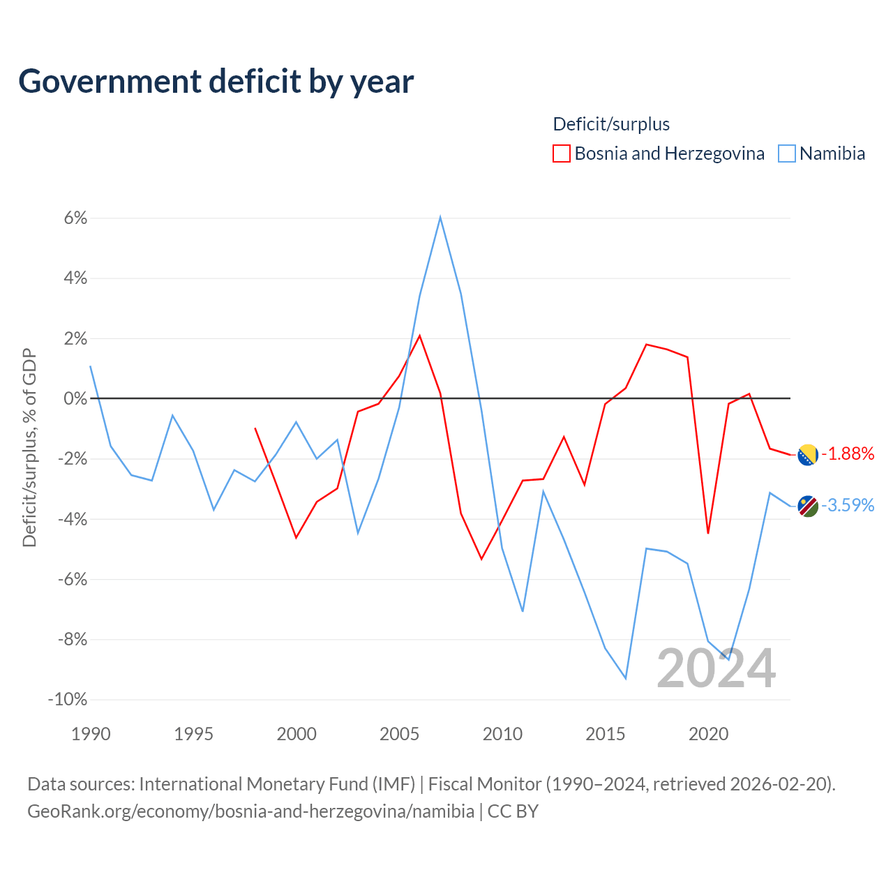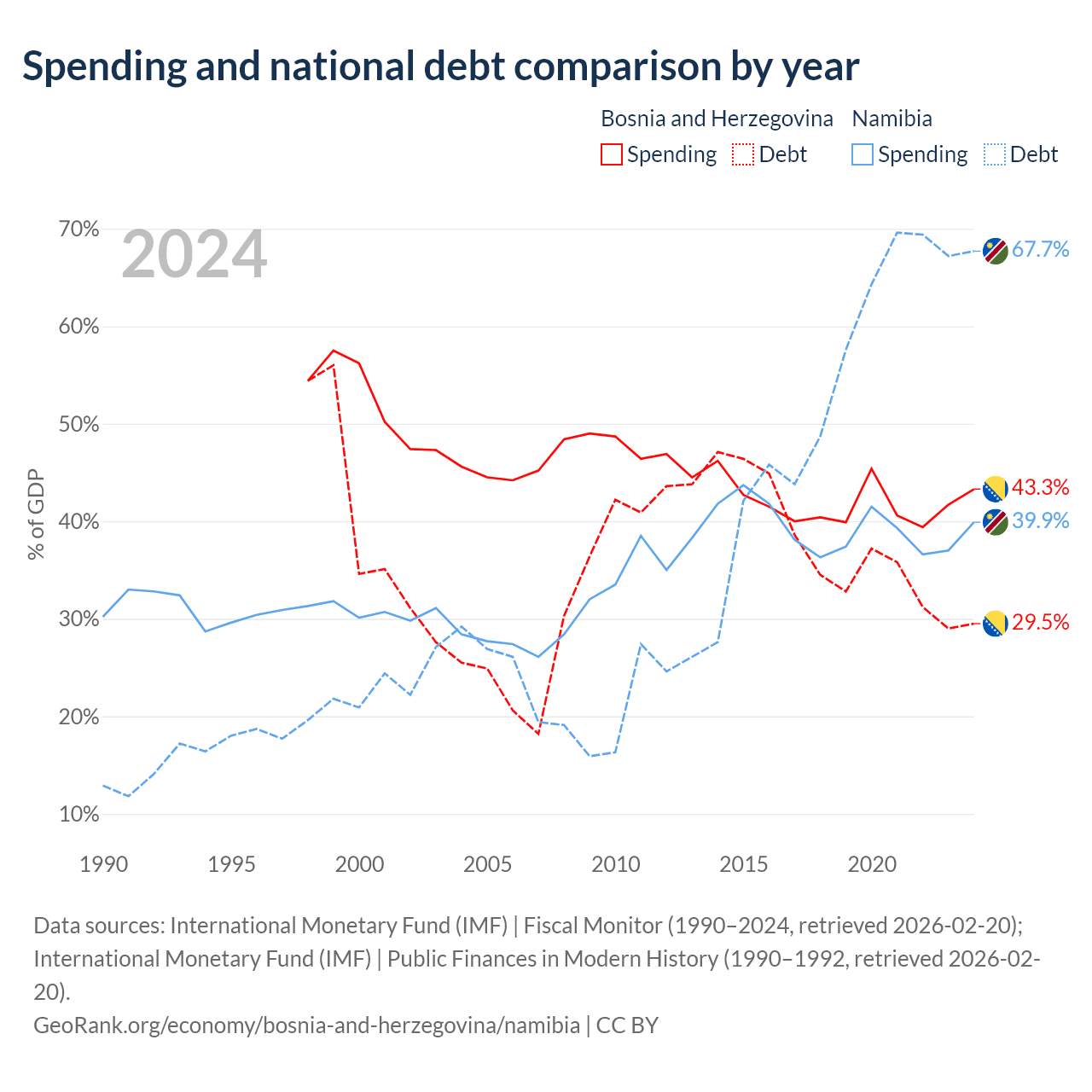 Bosnia and Herzegovina has $8.74B in government debt (29.5% of GDP), compared to $9.05B (67.7% of GDP) in Namibia.