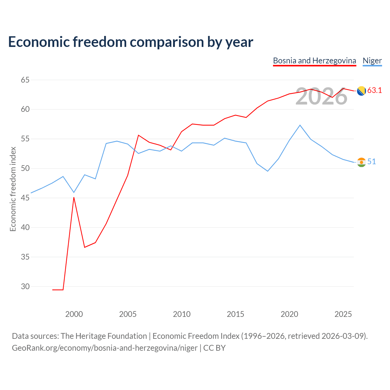 The Economic Freedom Index for Bosnia and Herzegovina is 63.1, ranking 83/197, compared to 51 for Niger, ranking 156/197. The chart above displays a comparison of annual changes in economic freedom indexes.