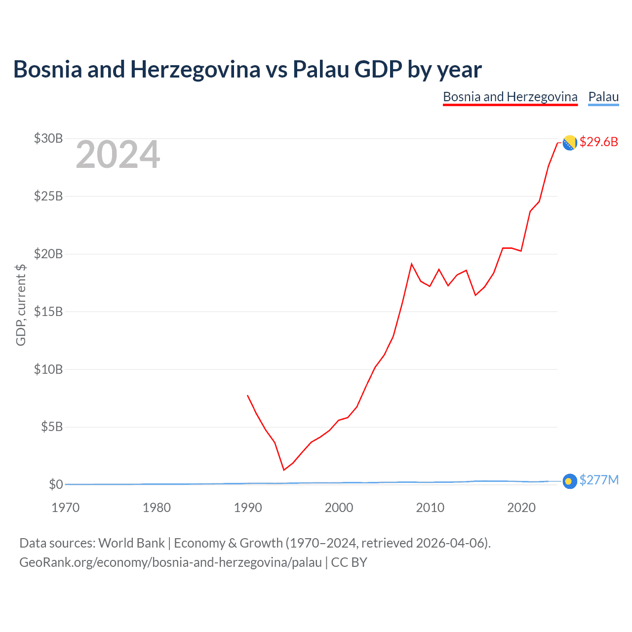 Bosnia and Herzegovina has a GDP of $29.6B compared to $277M for Palau, ranking 111/197 and 194/197 by economy size, respectively.
