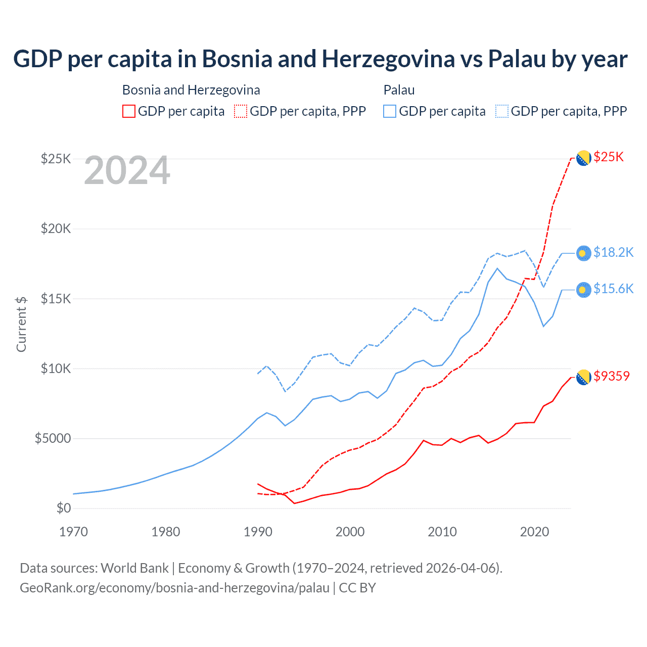 GDP per capita in Bosnia and Herzegovina vs Palau by year