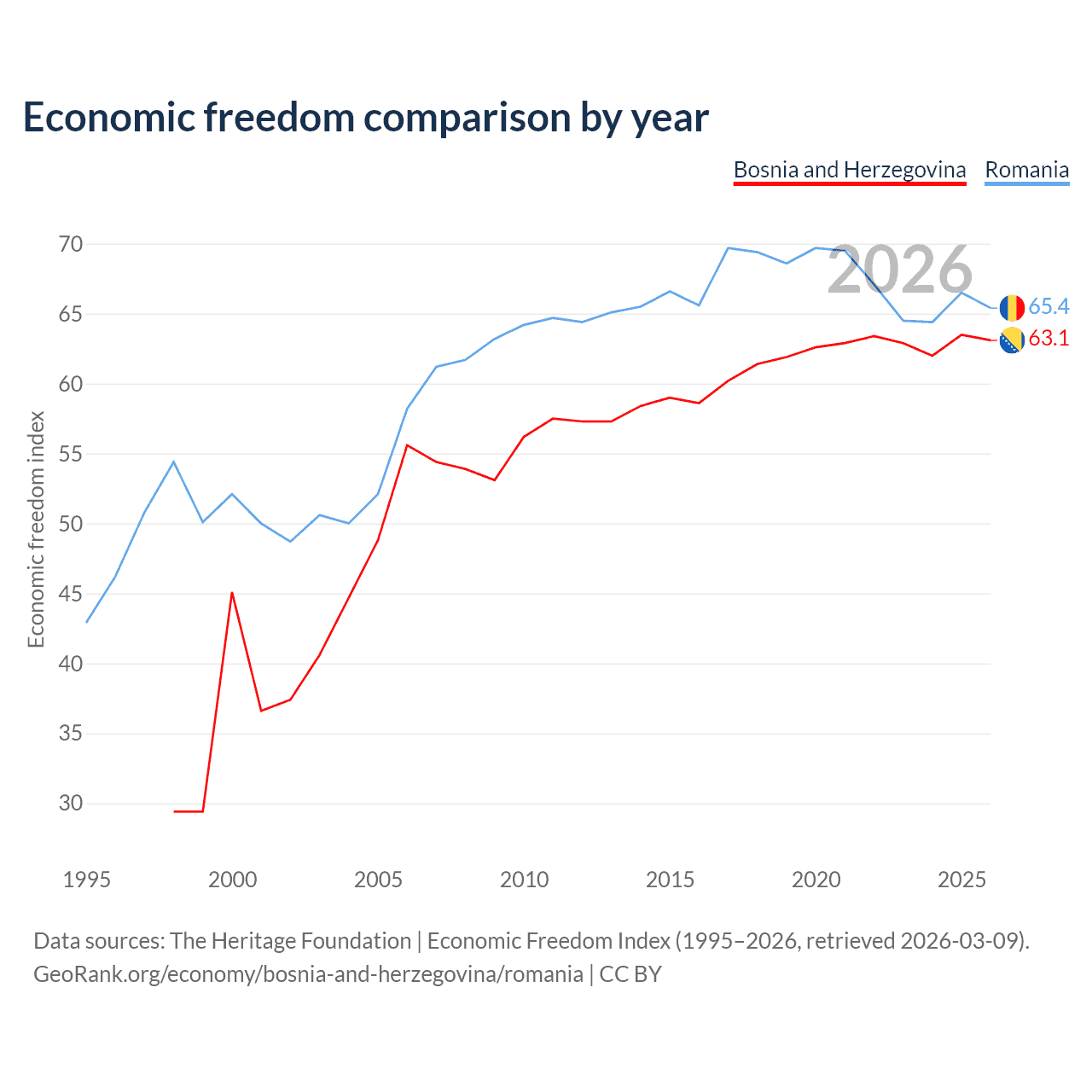 The Economic Freedom Index for Bosnia and Herzegovina is 63.1, ranking 83/197, compared to 65.4 for Romania, ranking 64/197. The chart above displays a comparison of annual changes in economic freedom indexes.