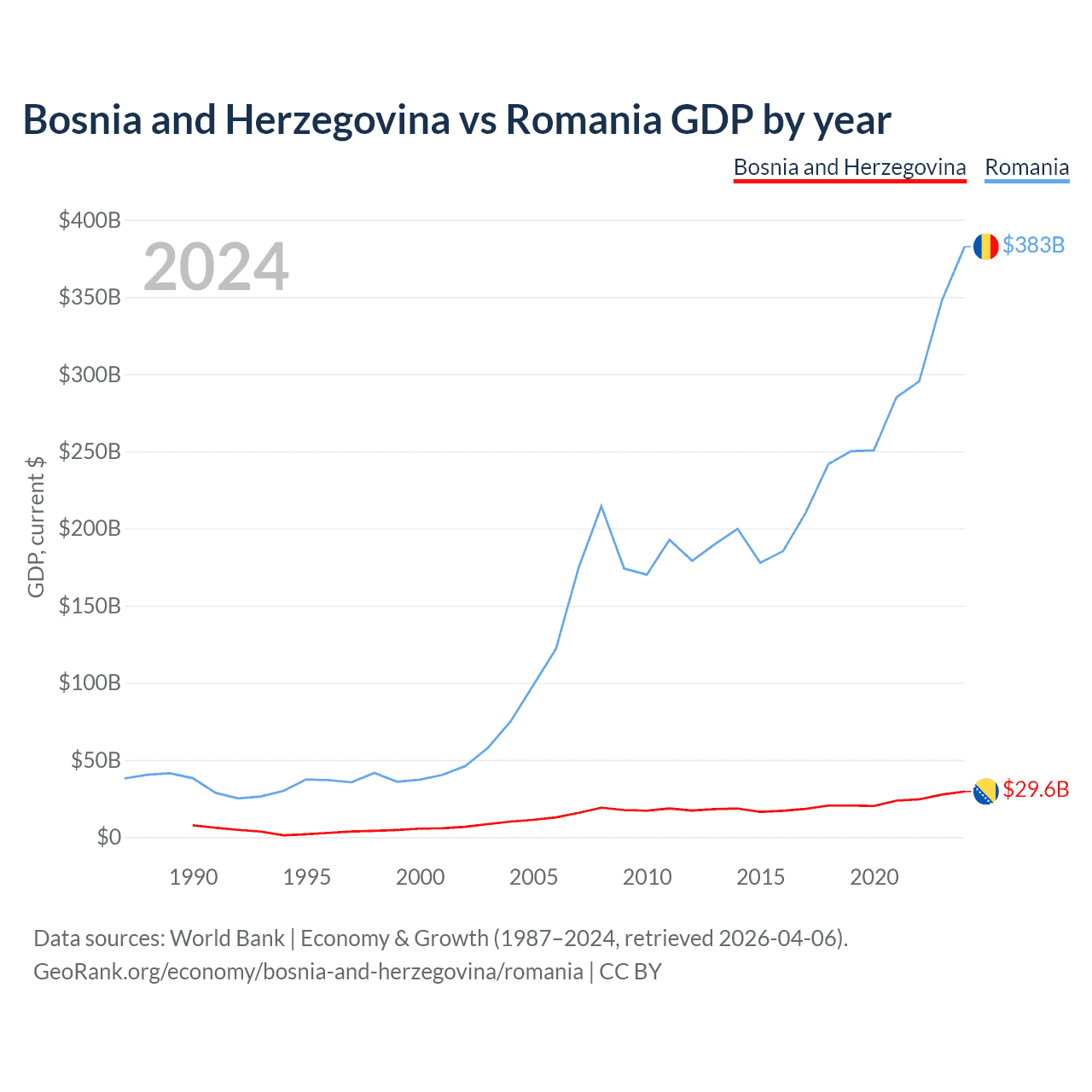 Bosnia and Herzegovina has a GDP of $29.6B compared to $383B for Romania, ranking 111/197 and 42/197 by economy size, respectively.