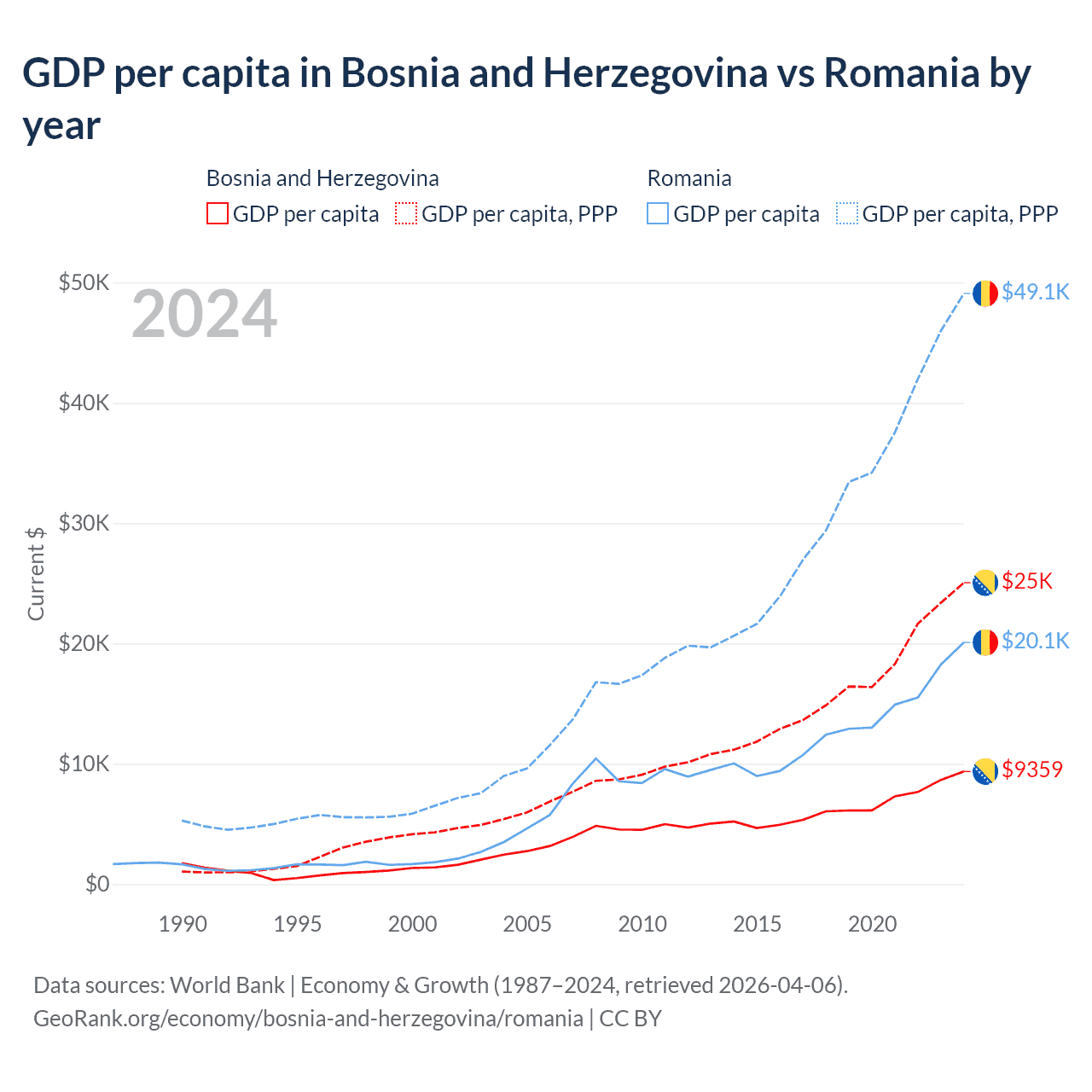 Bosnia and Herzegovina's GDP per capita is $9,359, ranking 87/197, compared to $20,080 in Romania, ranking 58/197. Adjusted for purchasing power (GDP per capita PPP), Bosnia and Herzegovina ranks 83rd at $25,043, while Romania ranks 47th at $49,077.