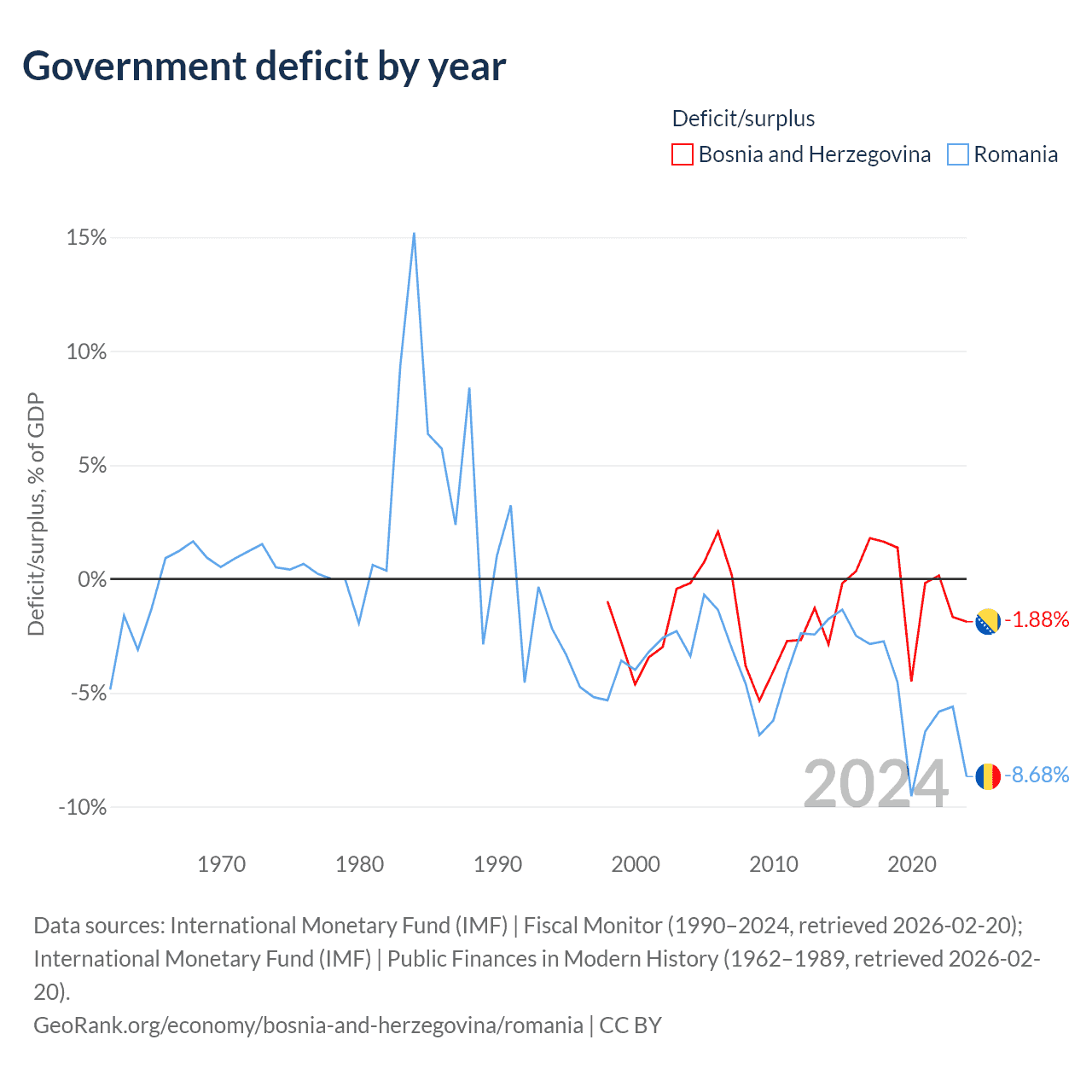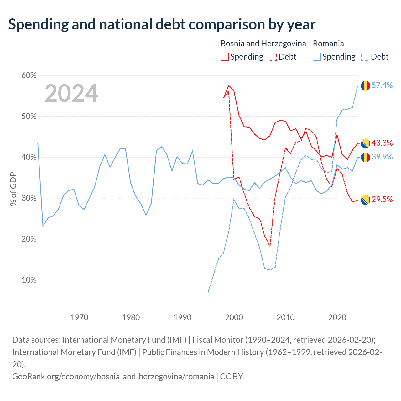 Bosnia and Herzegovina has $8.74B in government debt (29.5% of GDP), compared to $220B (57.4% of GDP) in Romania.