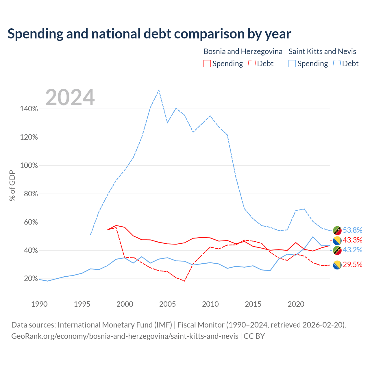 Bosnia and Herzegovina has $8.74B in government debt (29.5% of GDP), compared to $604M (53.8% of GDP) in Saint Kitts and Nevis.