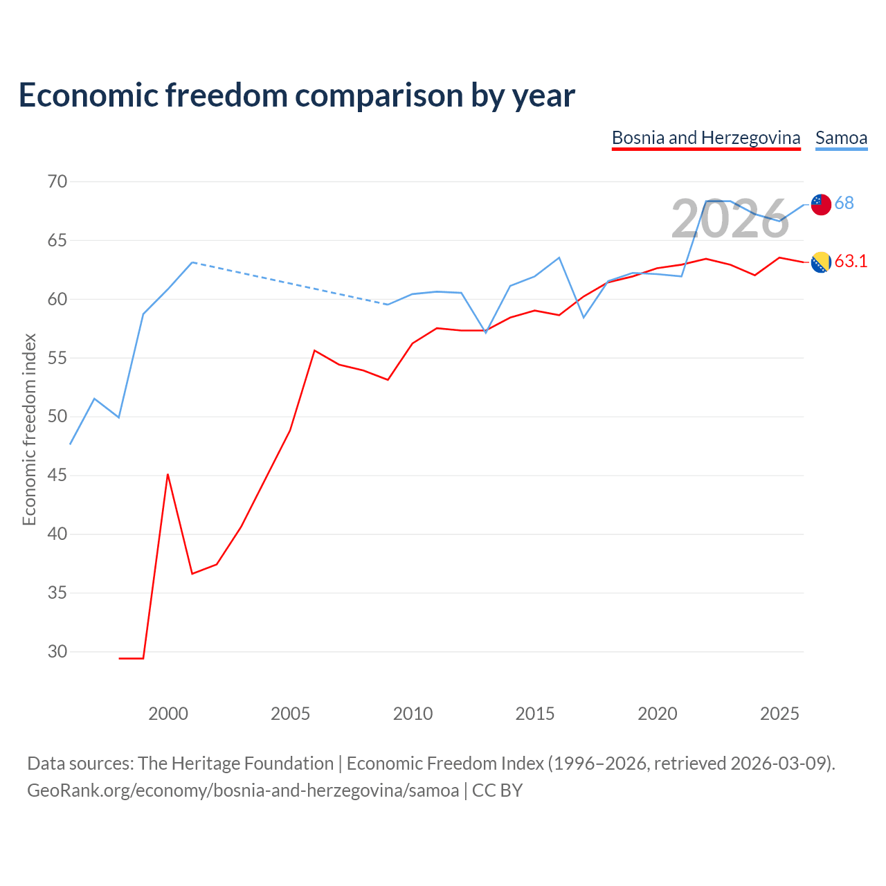 The Economic Freedom Index for Bosnia and Herzegovina is 63.1, ranking 83/197, compared to 68 for Samoa, ranking 52/197. The chart above displays a comparison of annual changes in economic freedom indexes.