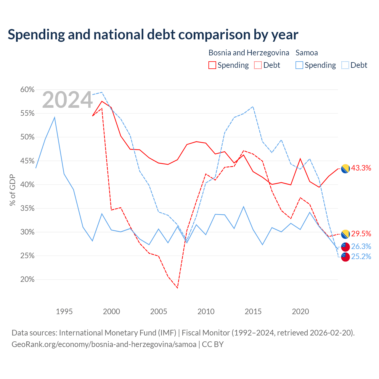 Bosnia and Herzegovina has $8.74B in government debt (29.5% of GDP), compared to $296M (25.2% of GDP) in Samoa.