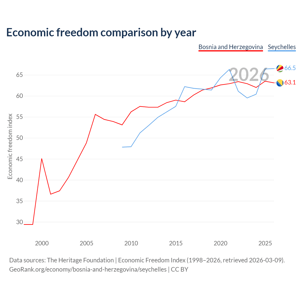 The Economic Freedom Index for Bosnia and Herzegovina is 63.1, ranking 83/197, compared to 66.5 for the Seychelles, ranking 60/197. The chart above displays a comparison of annual changes in economic freedom indexes.