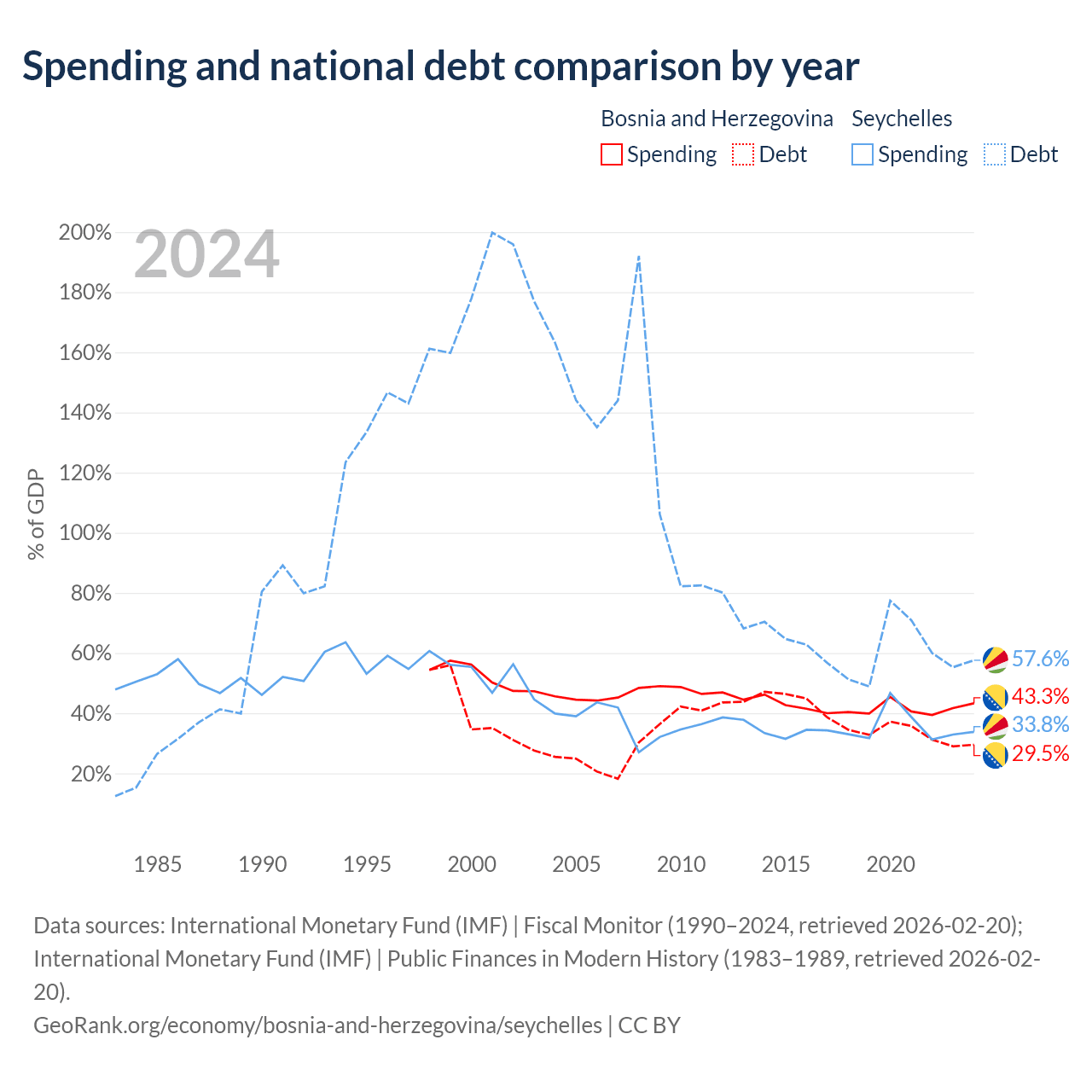 Bosnia and Herzegovina has $8.74B in government debt (29.5% of GDP), compared to $1.25B (57.6% of GDP) in the Seychelles.
