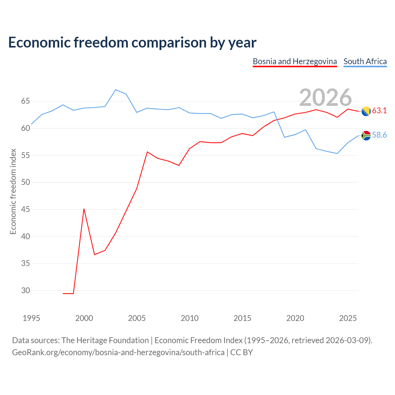 The Economic Freedom Index for Bosnia and Herzegovina is 63.1, ranking 83/197, compared to 58.6 for South Africa, ranking 110/197. The chart above displays a comparison of annual changes in economic freedom indexes.