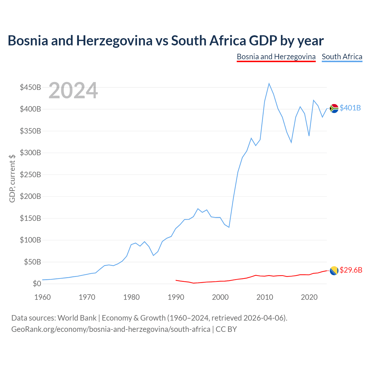Bosnia and Herzegovina has a GDP of $29.6B compared to $401B for South Africa, ranking 111/197 and 40/197 by economy size, respectively.