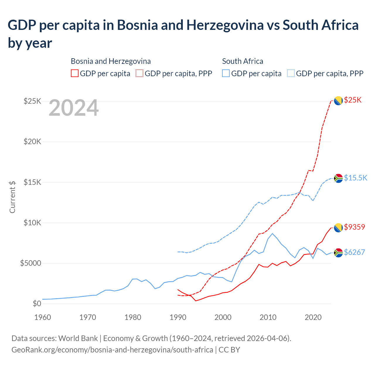 GDP per capita in Bosnia and Herzegovina vs South Africa by year