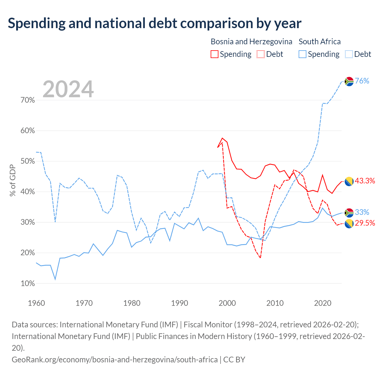 Bosnia and Herzegovina has $8.74B in government debt (29.5% of GDP), compared to $305B (76% of GDP) in South Africa.