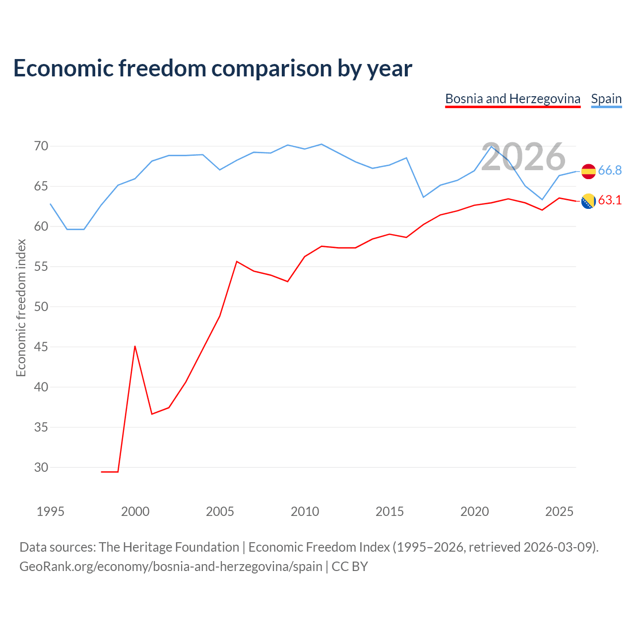 The Economic Freedom Index for Bosnia and Herzegovina is 63.1, ranking 83/197, compared to 66.8 for Spain, ranking 59/197. The chart above displays a comparison of annual changes in economic freedom indexes.