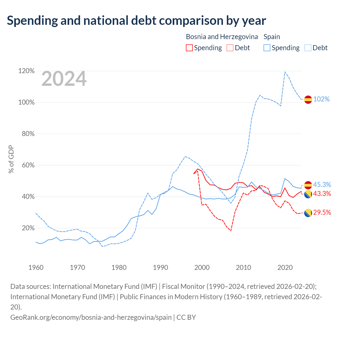 Bosnia and Herzegovina has $8.74B in government debt (29.5% of GDP), compared to $1.75T (101.6% of GDP) in Spain.