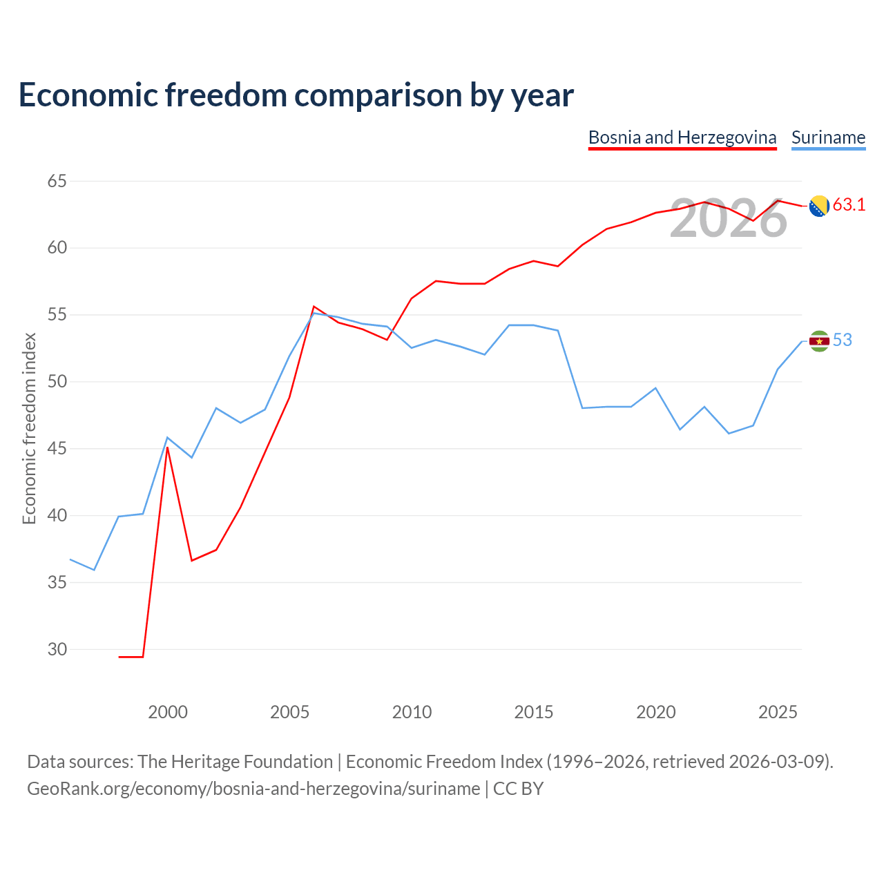 The Economic Freedom Index for Bosnia and Herzegovina is 63.1, ranking 83/197, compared to 53 for Suriname, ranking 143/197. The chart above displays a comparison of annual changes in economic freedom indexes.