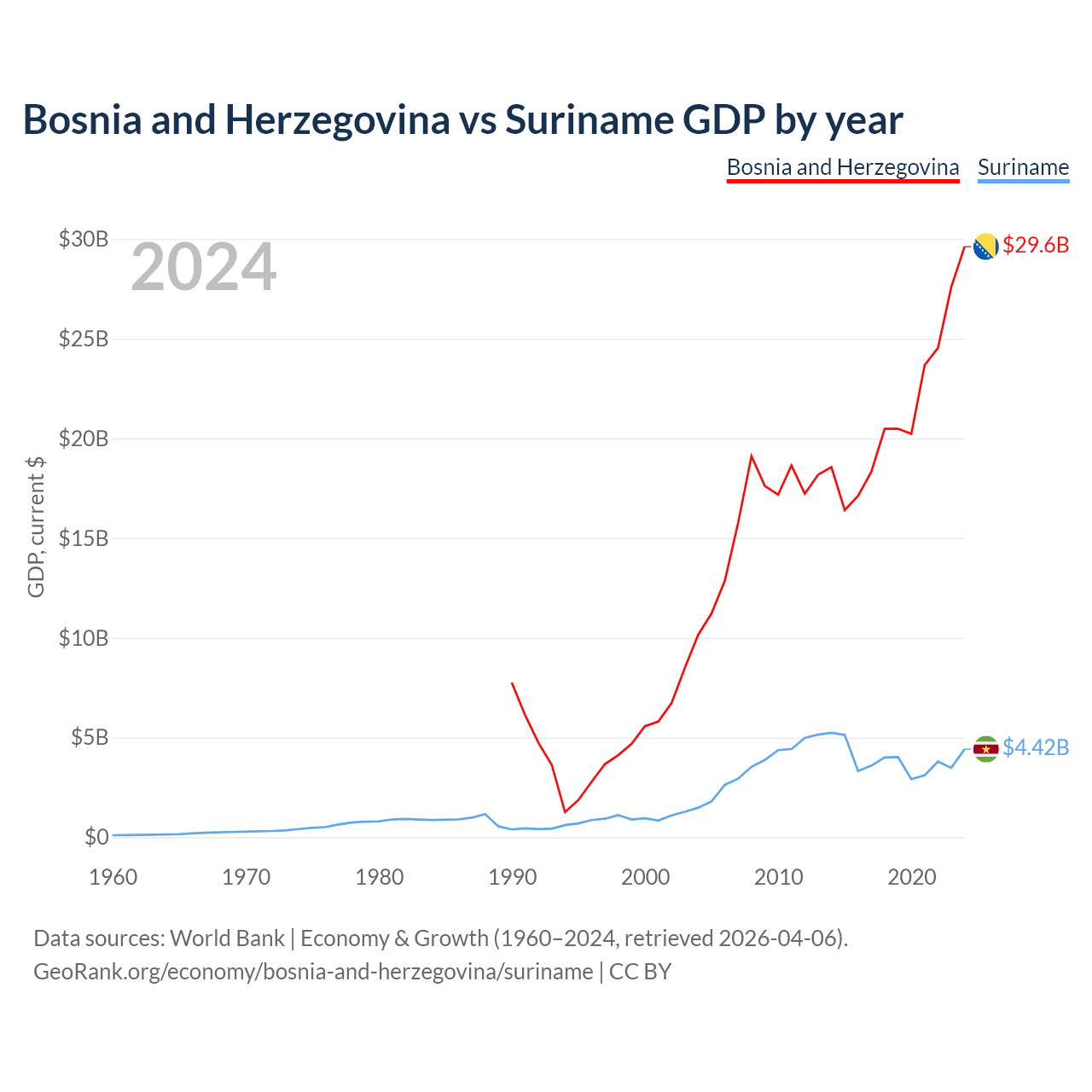 Bosnia and Herzegovina has a GDP of $29.6B compared to $4.42B for Suriname, ranking 111/197 and 164/197 by economy size, respectively.