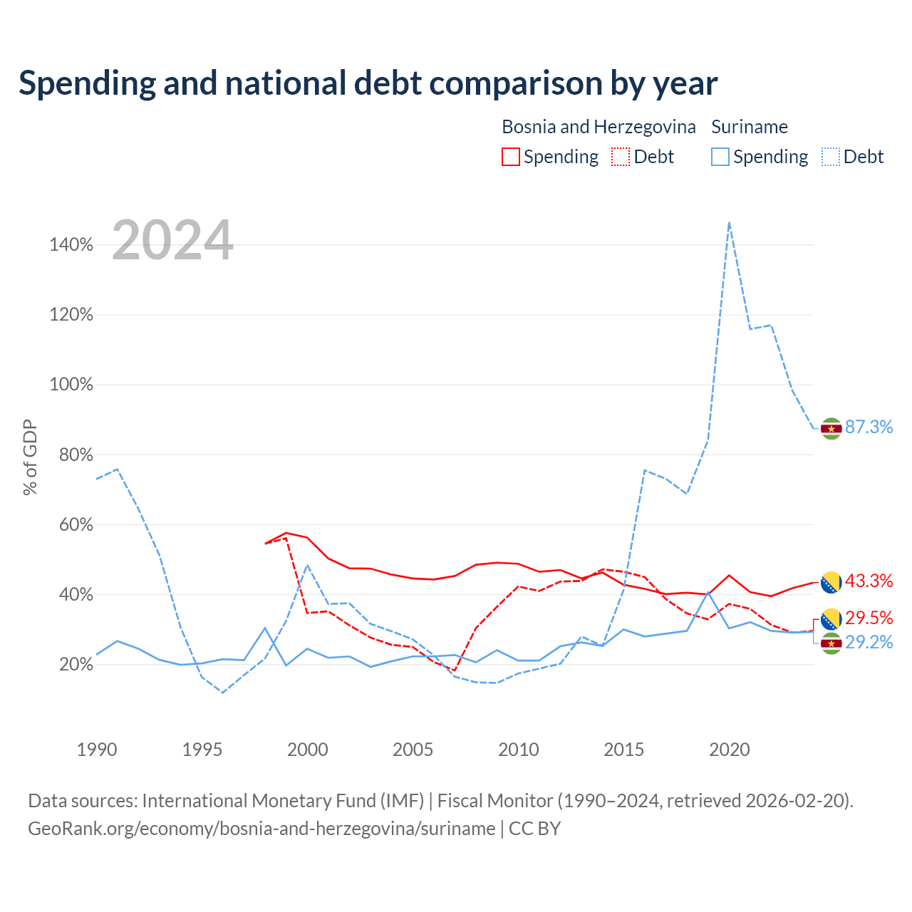 Bosnia and Herzegovina has $8.74B in government debt (29.5% of GDP), compared to $3.86B (87.3% of GDP) in Suriname.