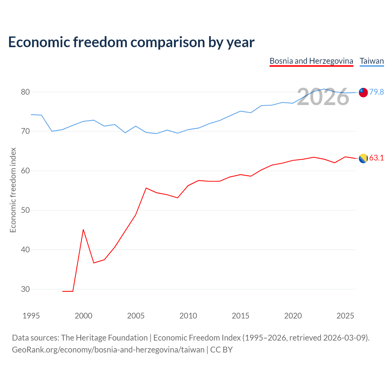 The Economic Freedom Index for Bosnia and Herzegovina is 63.1, ranking 83/197, compared to 79.8 for Taiwan, ranking 6/197. The chart above displays a comparison of annual changes in economic freedom indexes.