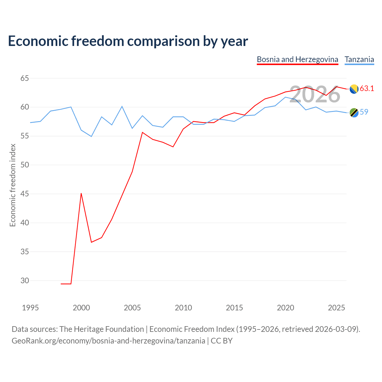 The Economic Freedom Index for Bosnia and Herzegovina is 63.1, ranking 83/197, compared to 59 for Tanzania, ranking 106/197. The chart above displays a comparison of annual changes in economic freedom indexes.