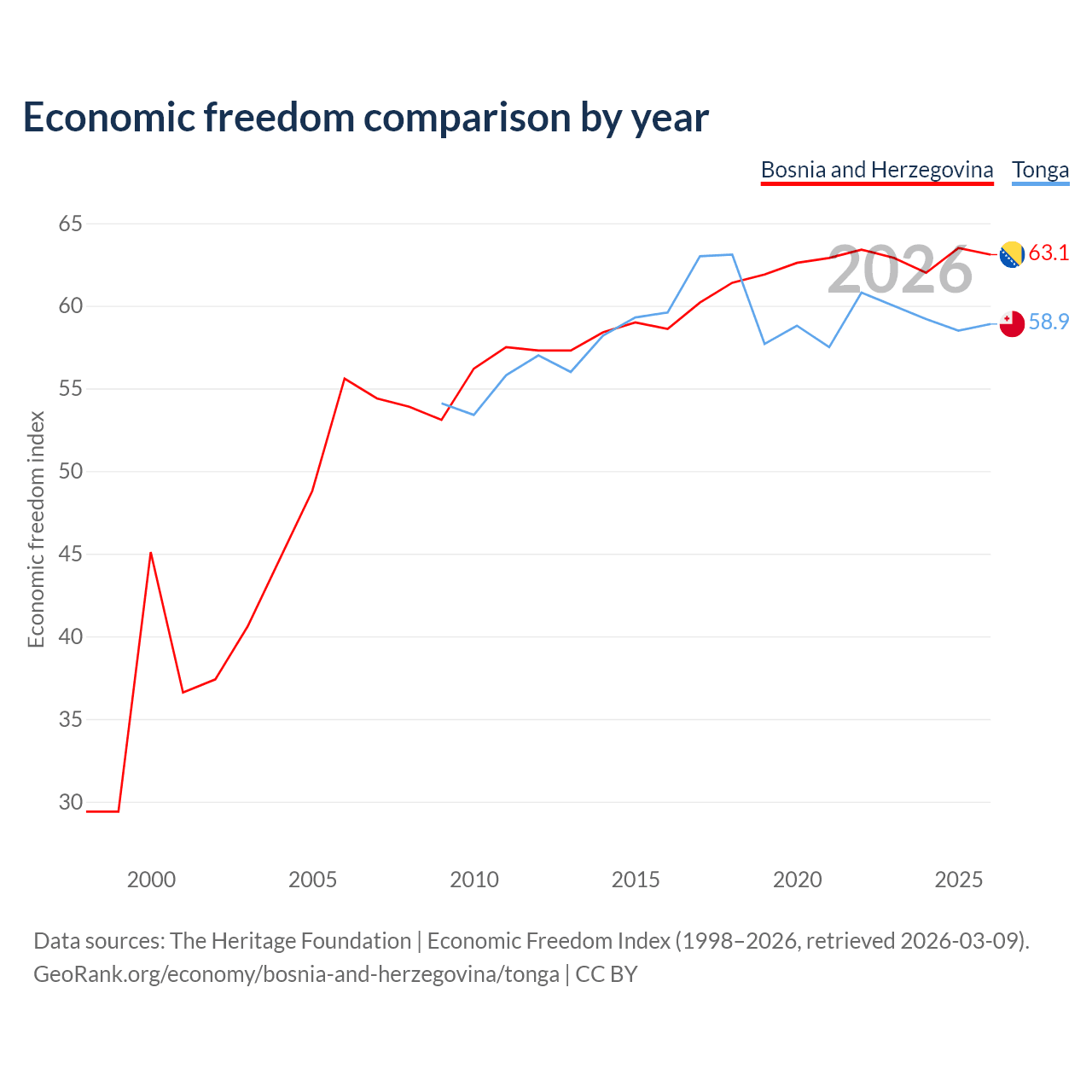 The Economic Freedom Index for Bosnia and Herzegovina is 63.1, ranking 83/197, compared to 58.9 for Tonga, ranking 107/197. The chart above displays a comparison of annual changes in economic freedom indexes.