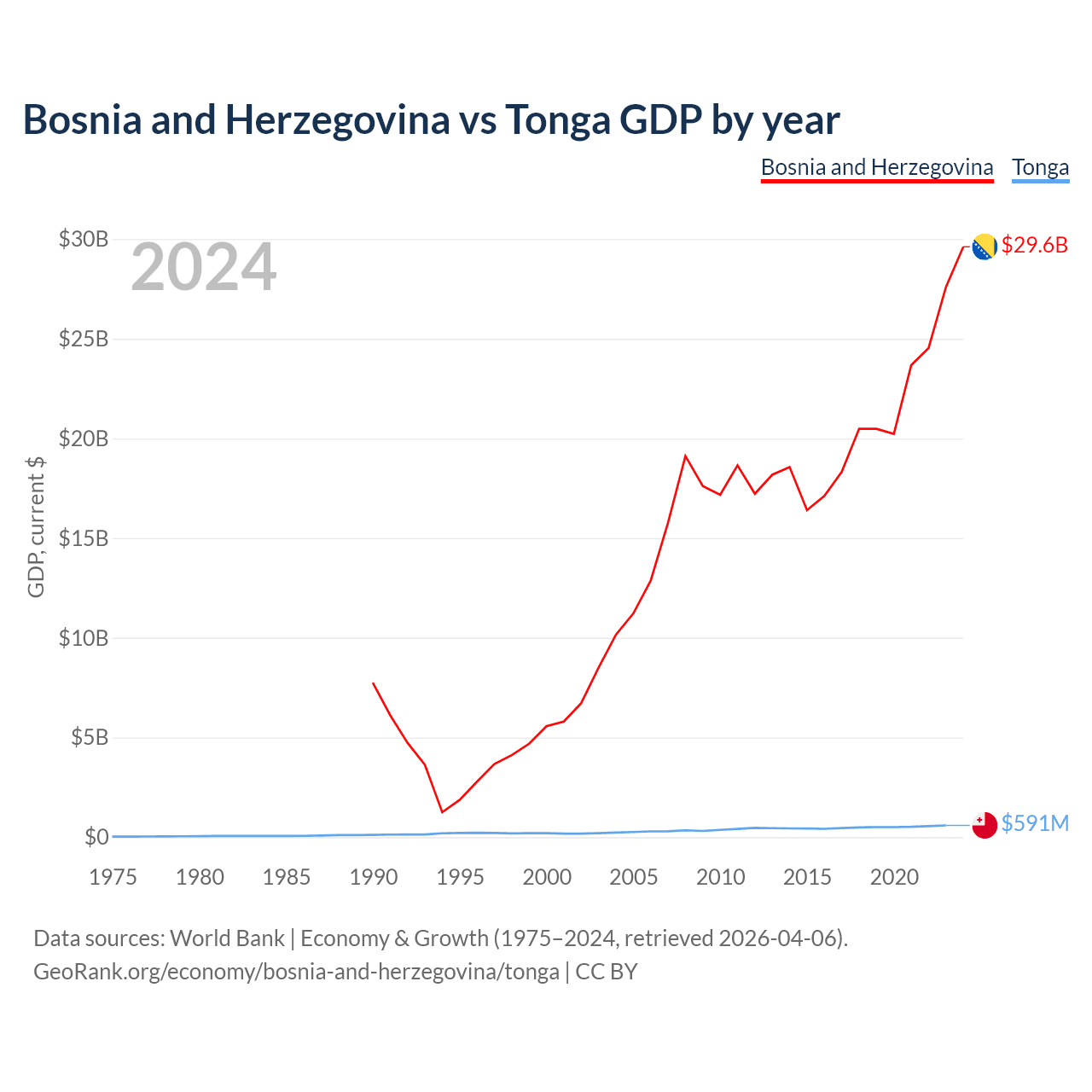 Bosnia and Herzegovina has a GDP of $29.6B compared to $591M for Tonga, ranking 111/197 and 191/197 by economy size, respectively.