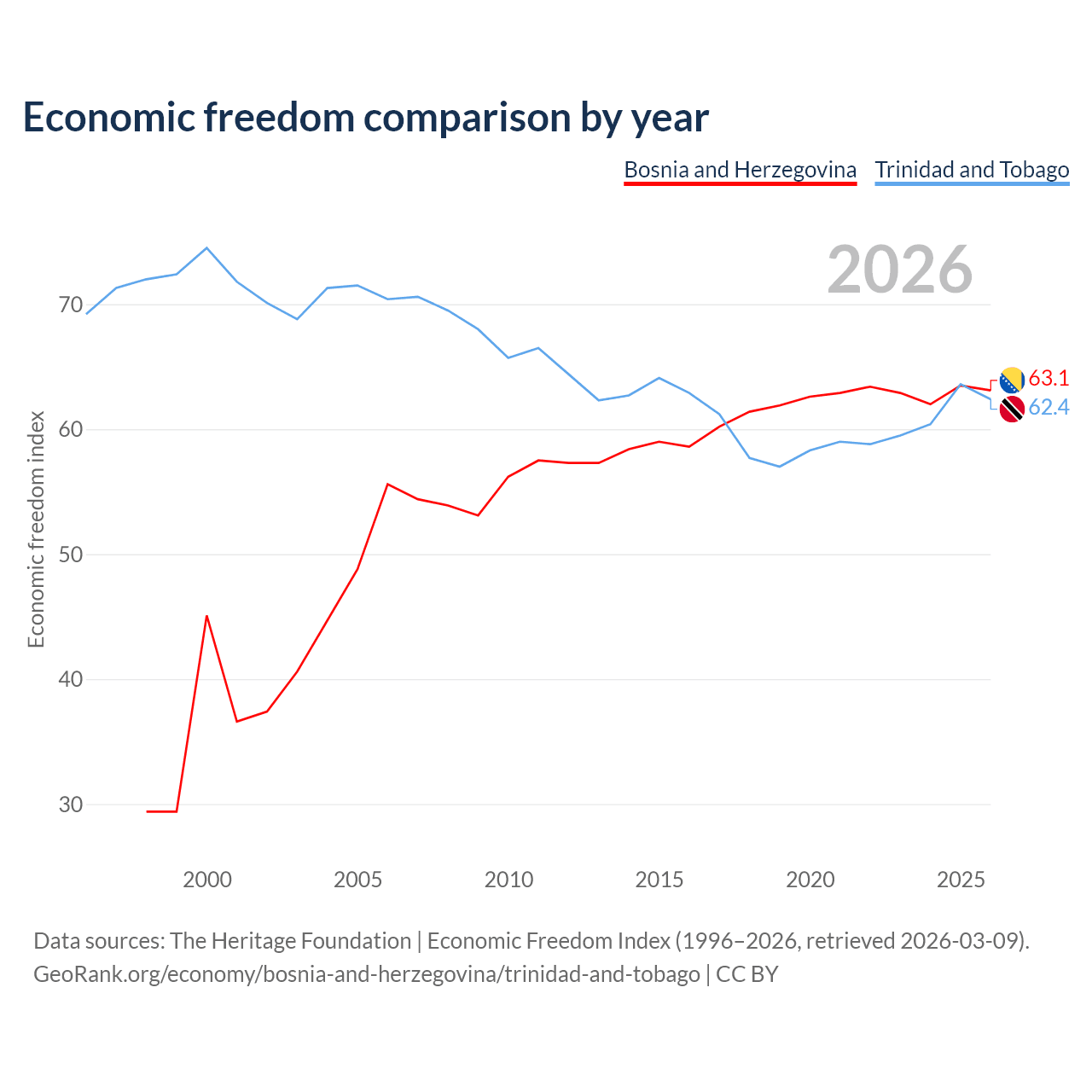 The Economic Freedom Index for Bosnia and Herzegovina is 63.1, ranking 83/197, compared to 62.4 for Trinidad and Tobago, ranking 87/197. The chart above displays a comparison of annual changes in economic freedom indexes.