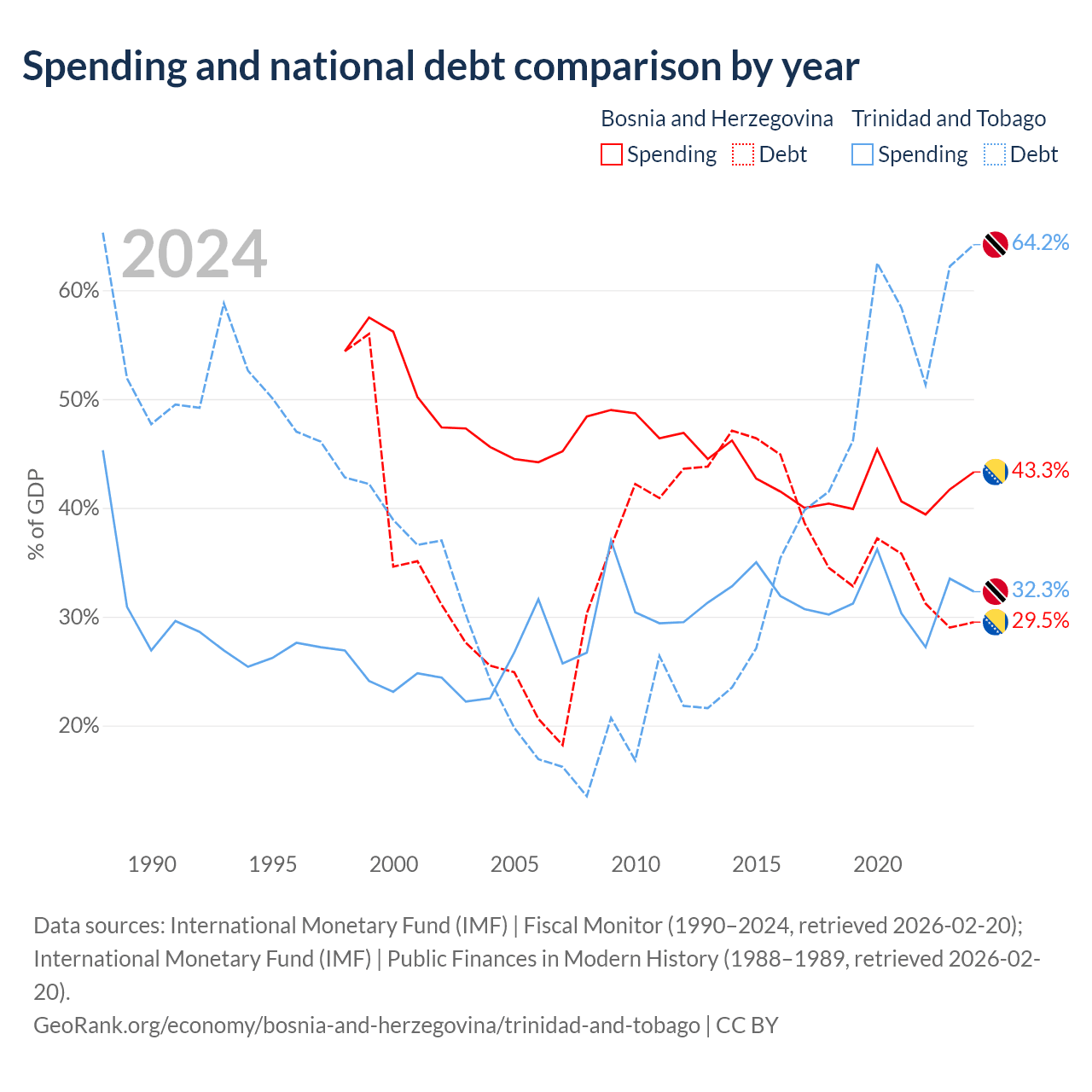 Bosnia and Herzegovina has $8.74B in government debt (29.5% of GDP), compared to $16.5B (64.2% of GDP) in Trinidad and Tobago.