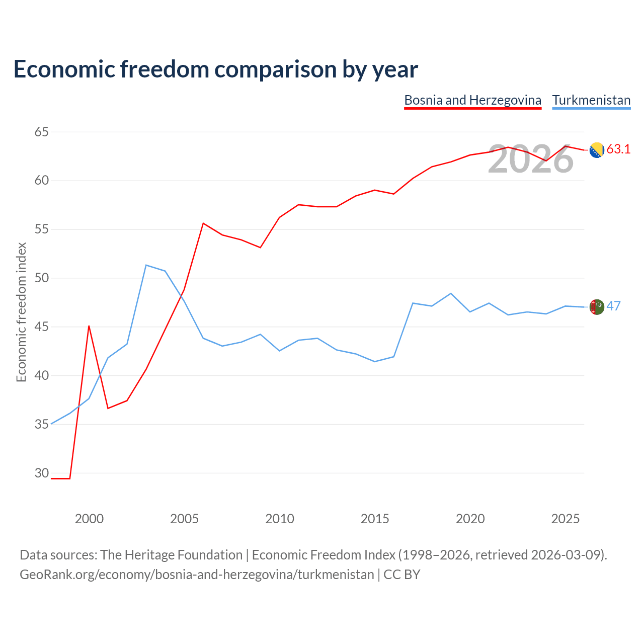 The Economic Freedom Index for Bosnia and Herzegovina is 63.1, ranking 83/197, compared to 47 for Turkmenistan, ranking 177/197. The chart above displays a comparison of annual changes in economic freedom indexes.