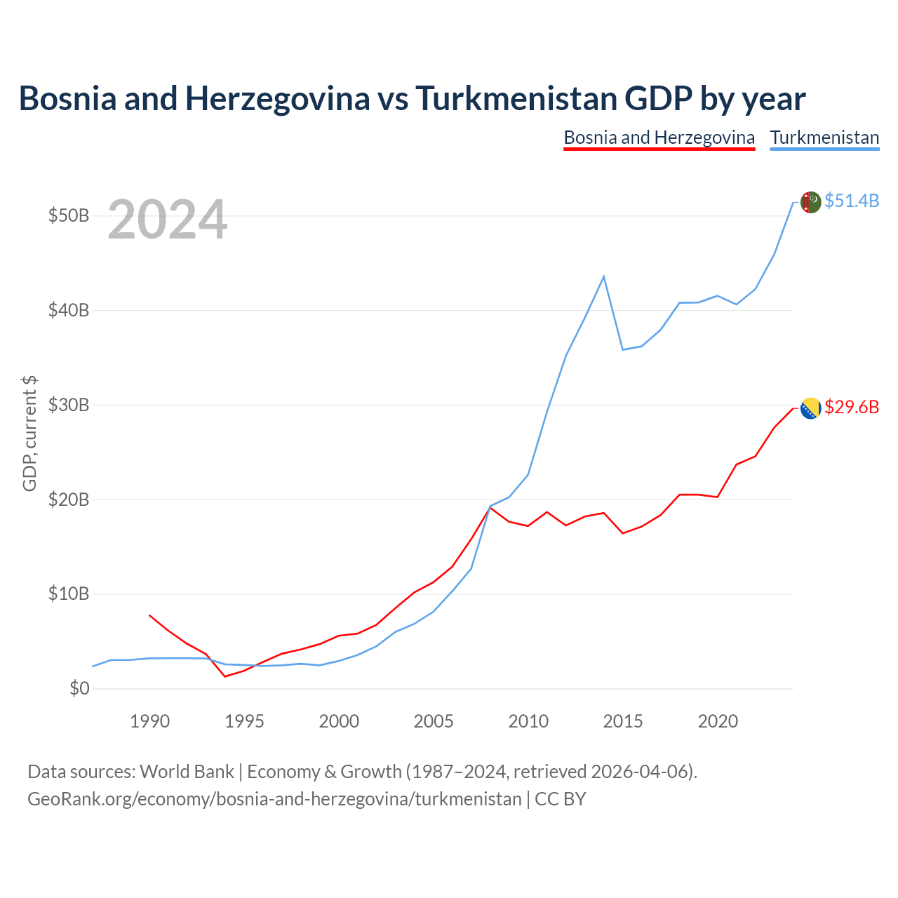 Bosnia and Herzegovina has a GDP of $29.6B compared to $51.4B for Turkmenistan, ranking 111/197 and 92/197 by economy size, respectively.
