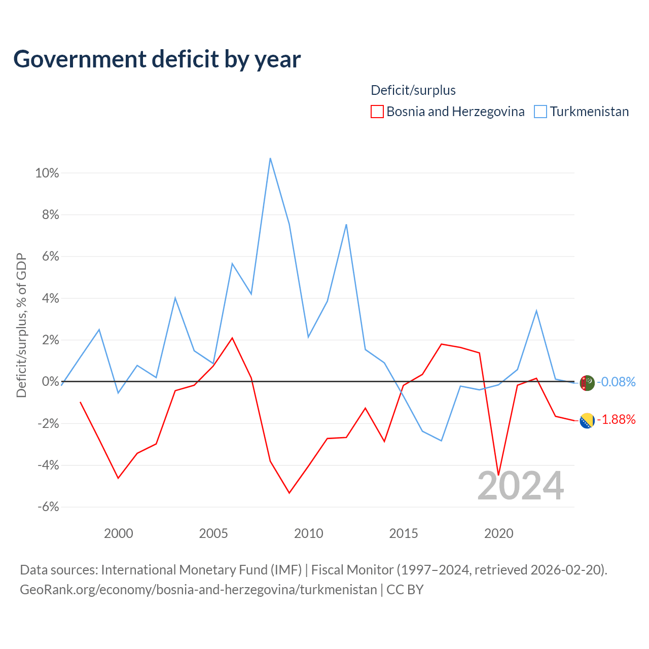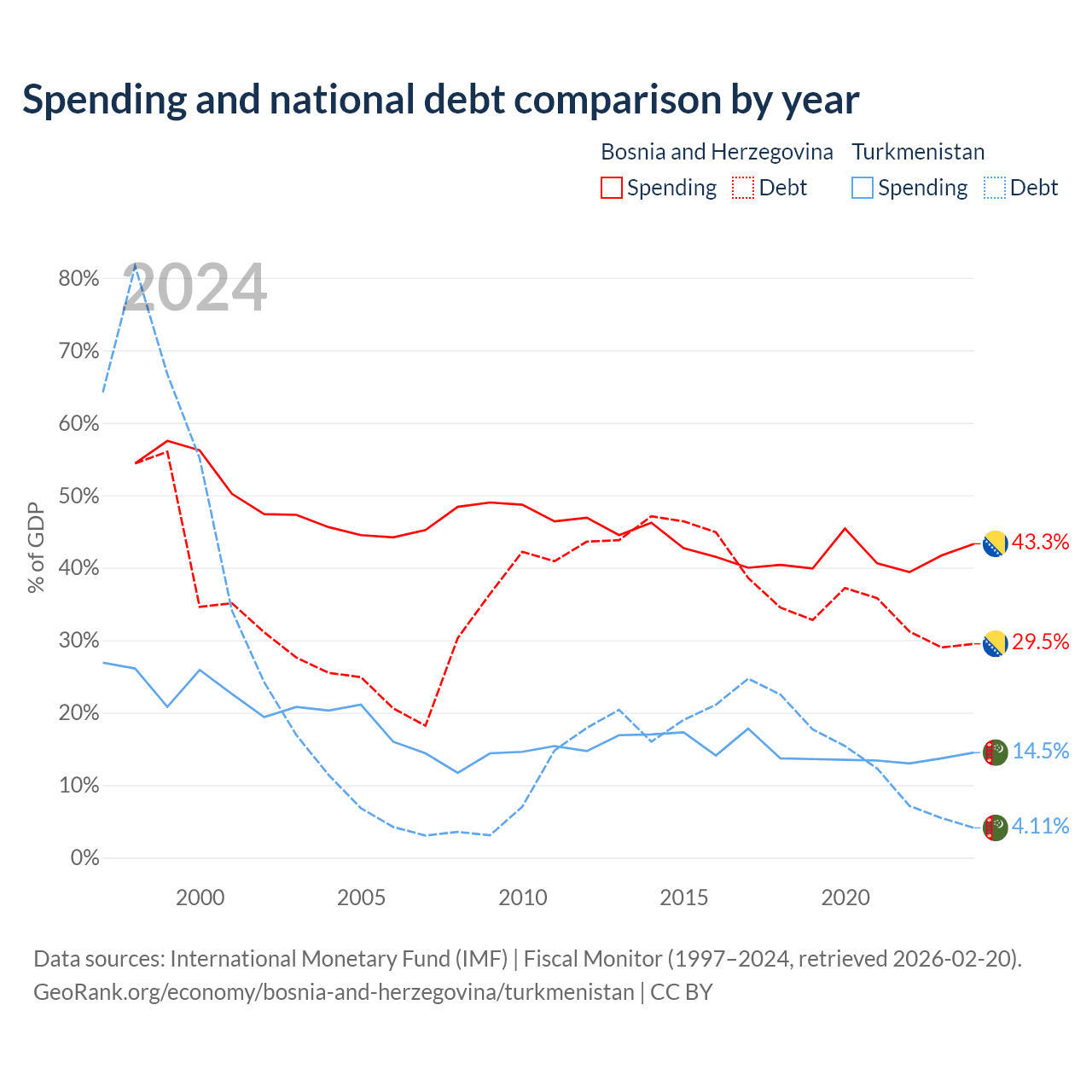 Bosnia and Herzegovina has $8.74B in government debt (29.5% of GDP), compared to $2.11B (4.11% of GDP) in Turkmenistan.