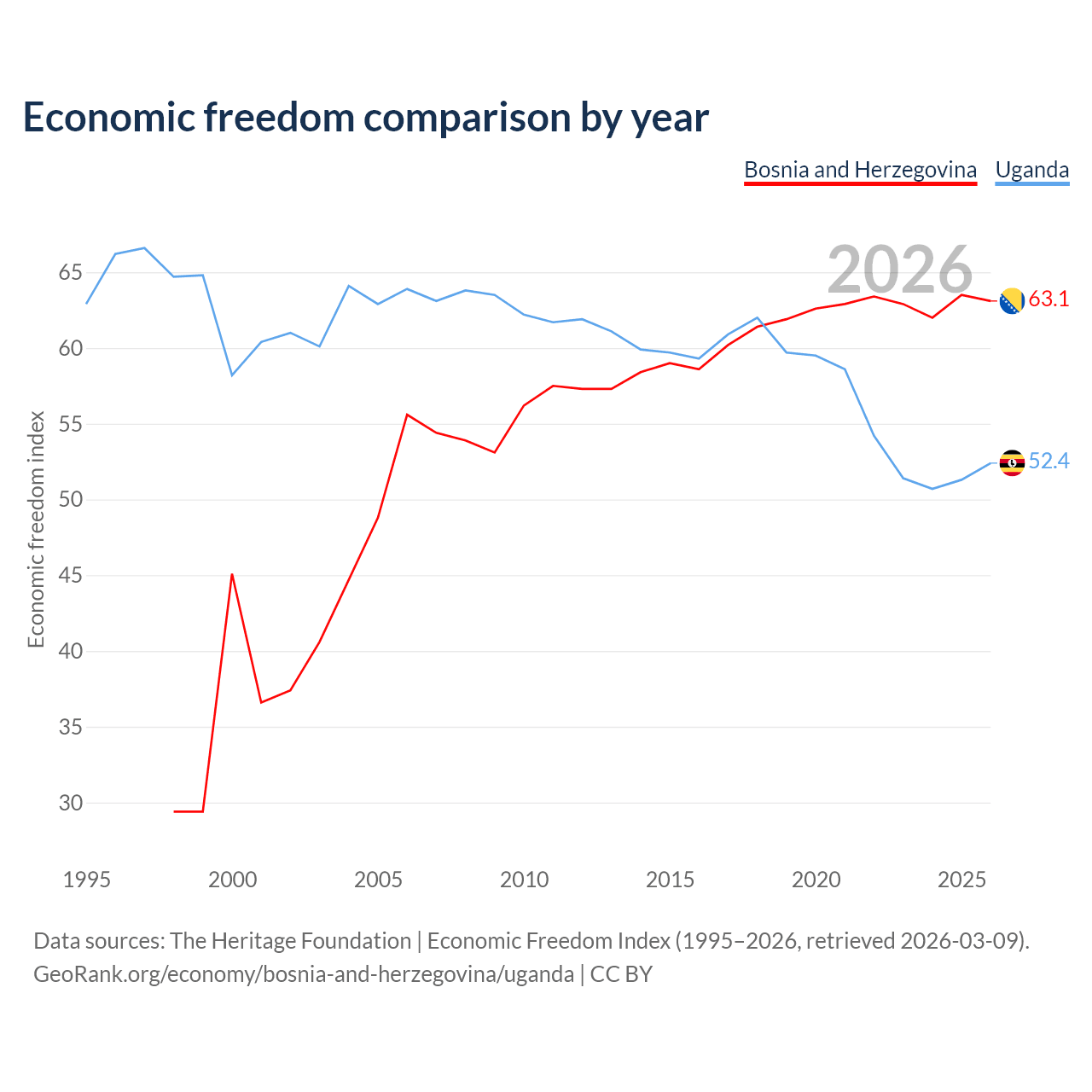 The Economic Freedom Index for Bosnia and Herzegovina is 63.1, ranking 83/197, compared to 52.4 for Uganda, ranking 149/197. The chart above displays a comparison of annual changes in economic freedom indexes.
