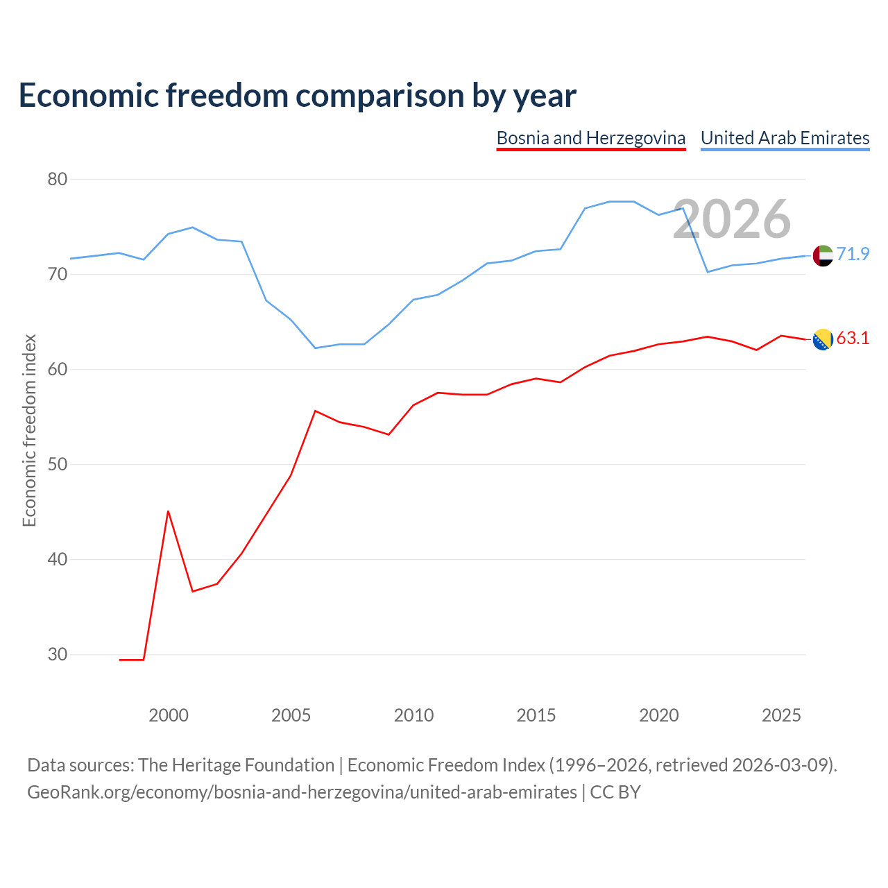 The Economic Freedom Index for Bosnia and Herzegovina is 63.1, ranking 83/197, compared to 71.9 for the United Arab Emirates, ranking 29/197. The chart above displays a comparison of annual changes in economic freedom indexes.