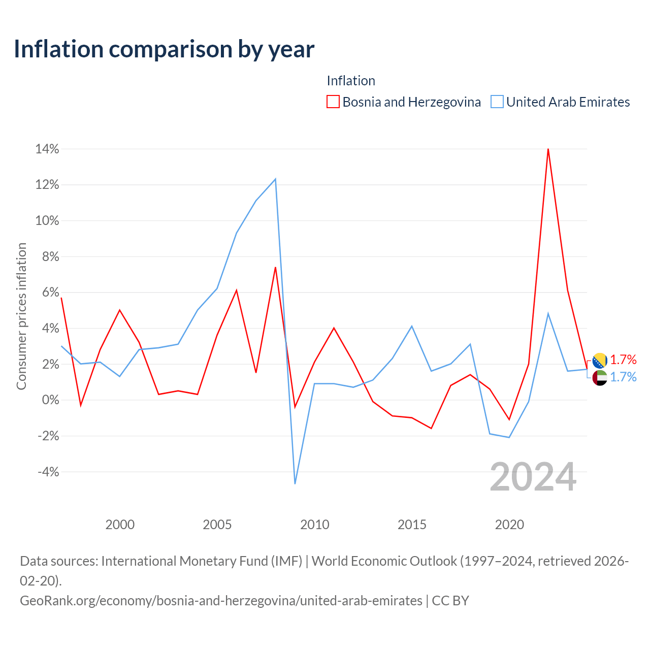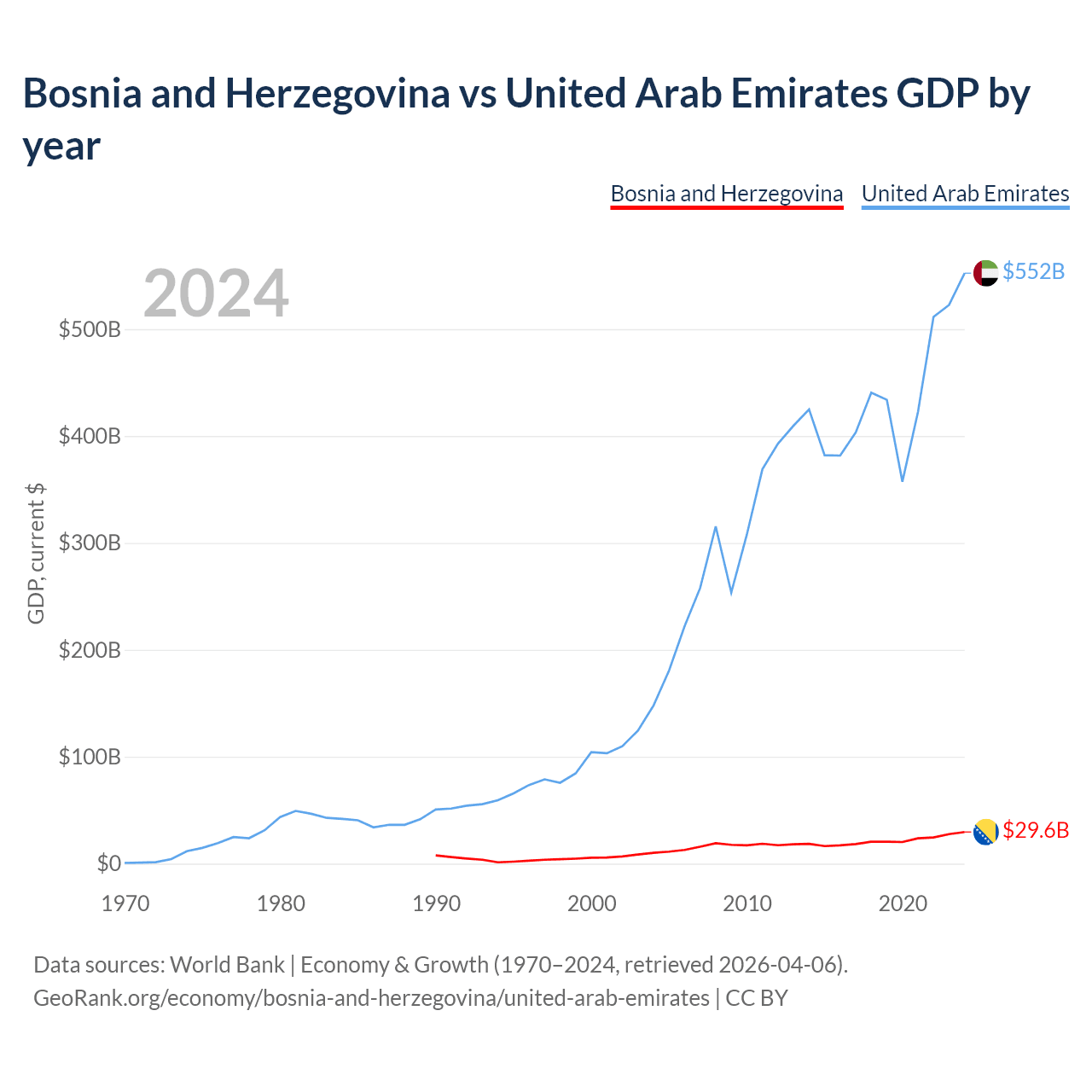 Bosnia and Herzegovina has a GDP of $29.6B compared to $552B for the United Arab Emirates, ranking 111/197 and 27/197 by economy size, respectively.
